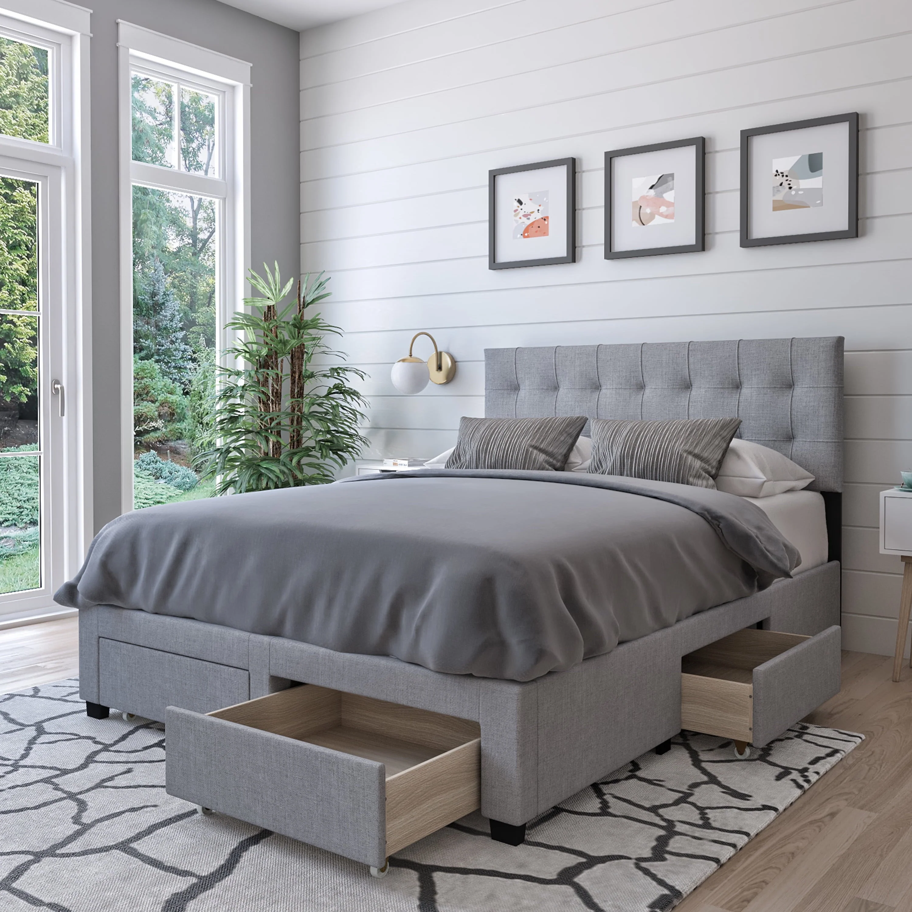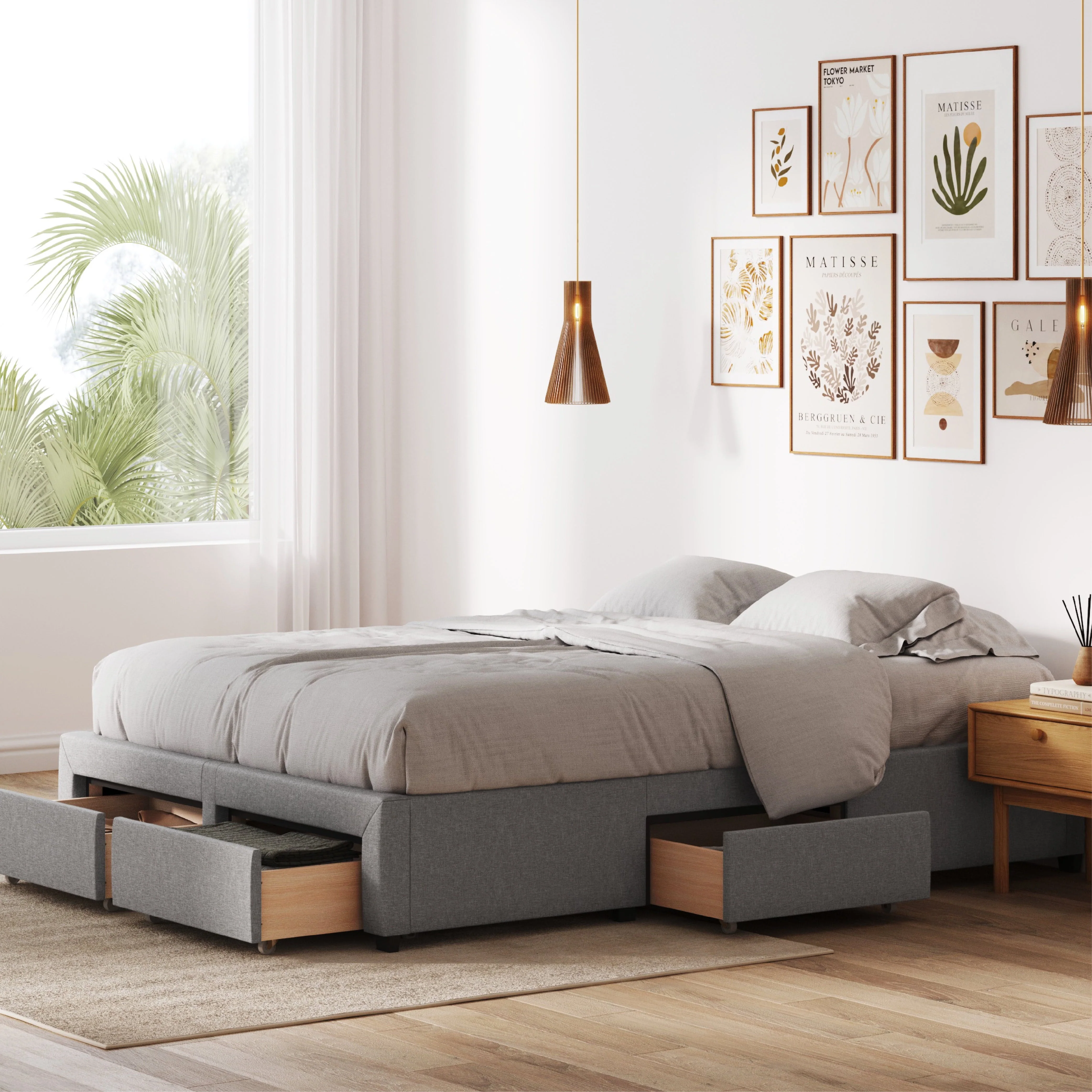 DG Casa Cosmo Upholstered Platform Bed Frame Base with Storage, Queen Size, Gray