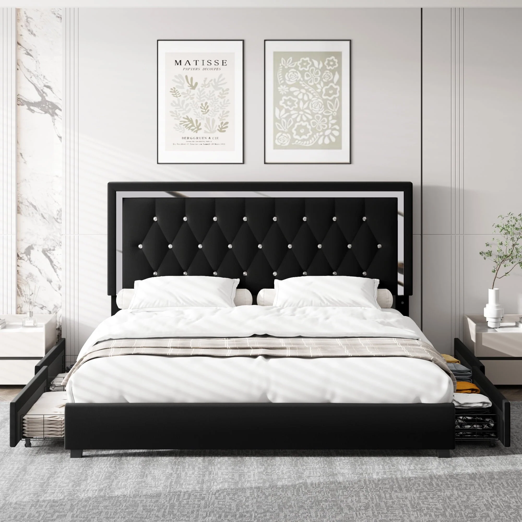 Homfa Queen Size Storage Bed with 4 Drawers, Crystal Buckle Upholstered Platform Bed Frame with Adjustable Headboard for Bedroom, Black
