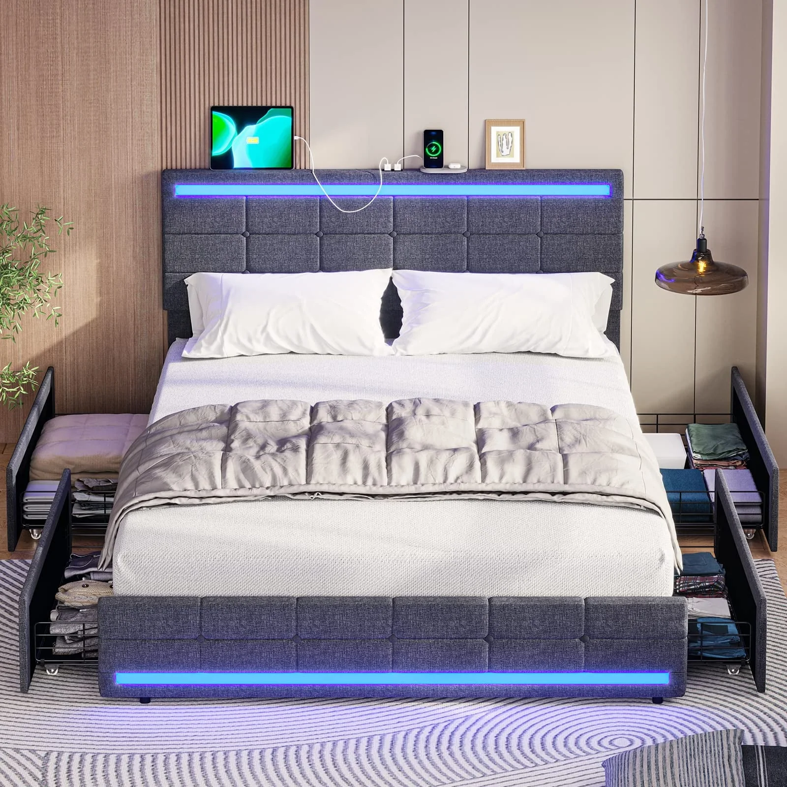 Full Size Bed Frame with 4 Storage Drawers, Platform Bed Frame with 2 USB Ports, Upholstered Bed with LED Headboard Footboard, Square Stitched Button Tufted Design, Dark Grey