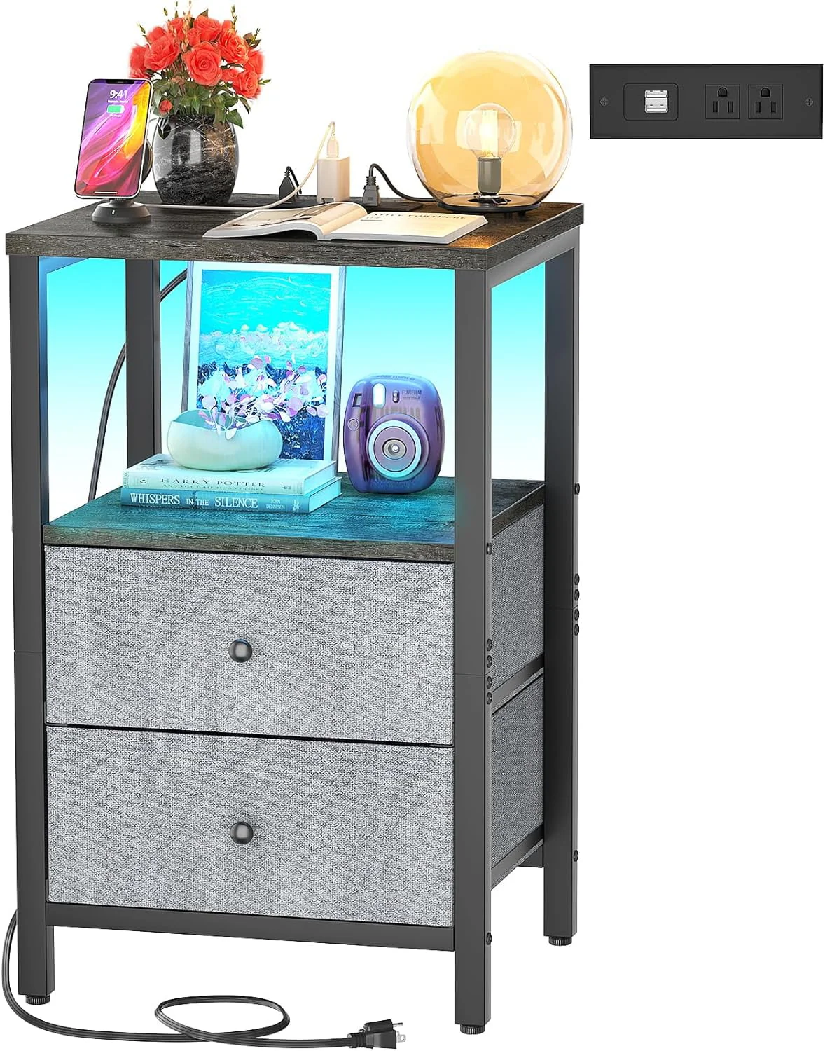 Nightstand With Charging Station And LED Lights, Night Stand With 2 Drawers, 25.6'' End Table Bedside Tables With Storage, 3 Tier Tall Night Stand With Storage For Bedroom Living Room, Grey