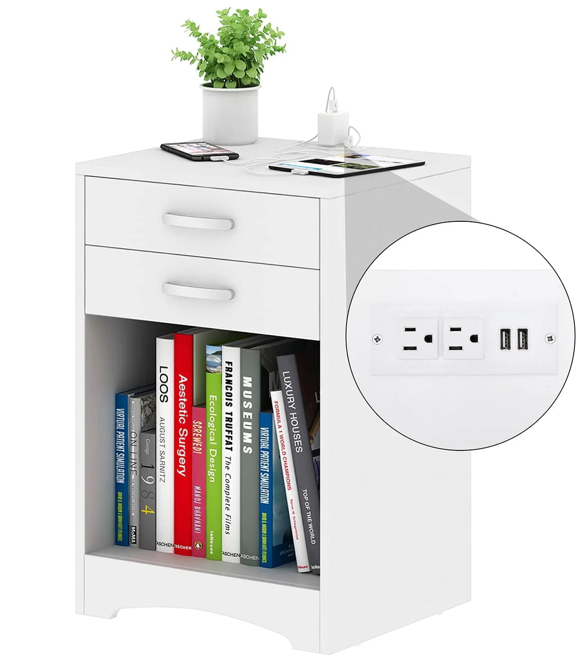 White Nightstand with Charging Station 2 Drawer Bedroom Nightstand Wood Sofa Side Table End Table with USB Ports and Storage, Small Kids Nightstand