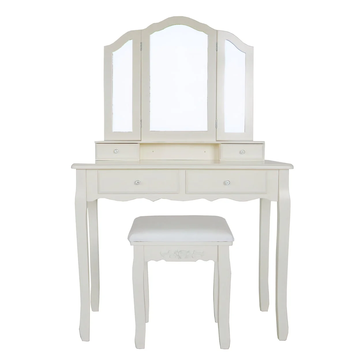 35 Inch 3 Piece Vanity Desk Set with Cushioned Stool and Elegant Trifold Mirror, 4 Drawers, Off White Solid Wood-Saltoro