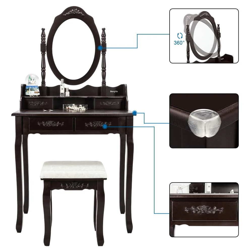 UBesGoo 4 Drawer Vanity Makeup Dressing Table Set w/Stool&Mirror Jewelry Wood Brown