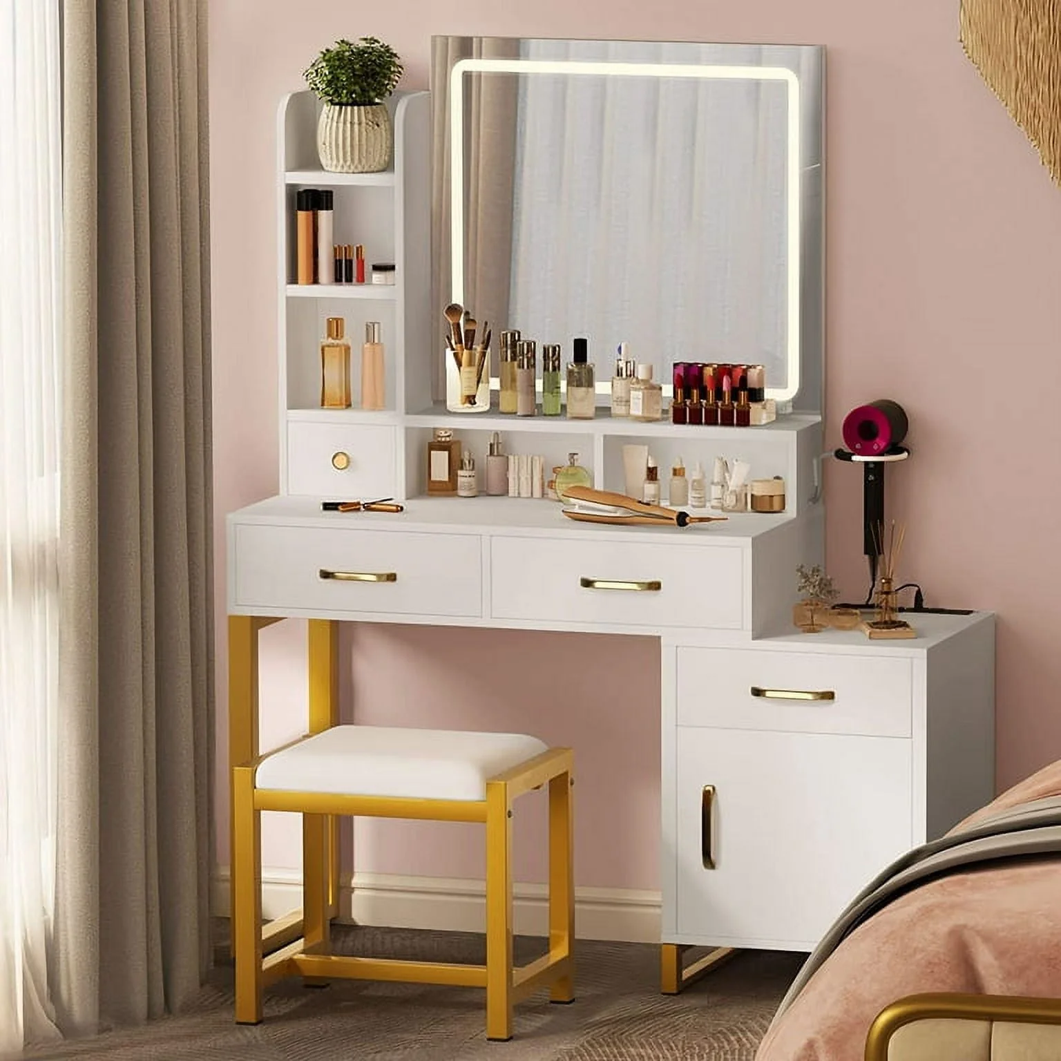 Ktaxon Makeup Vanity Table Set Mirror with LED Lights Dressing Table and Stool Set,Bedroom Vanities Tables with Benches