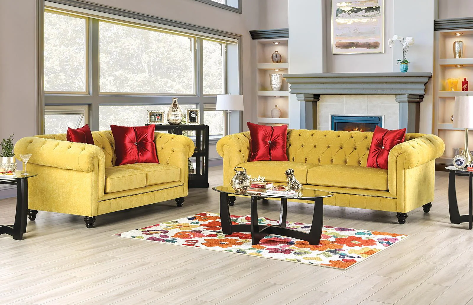 Glam Royal Yellow & Red Microfiber Sofa and Loveseat FOA Eliza