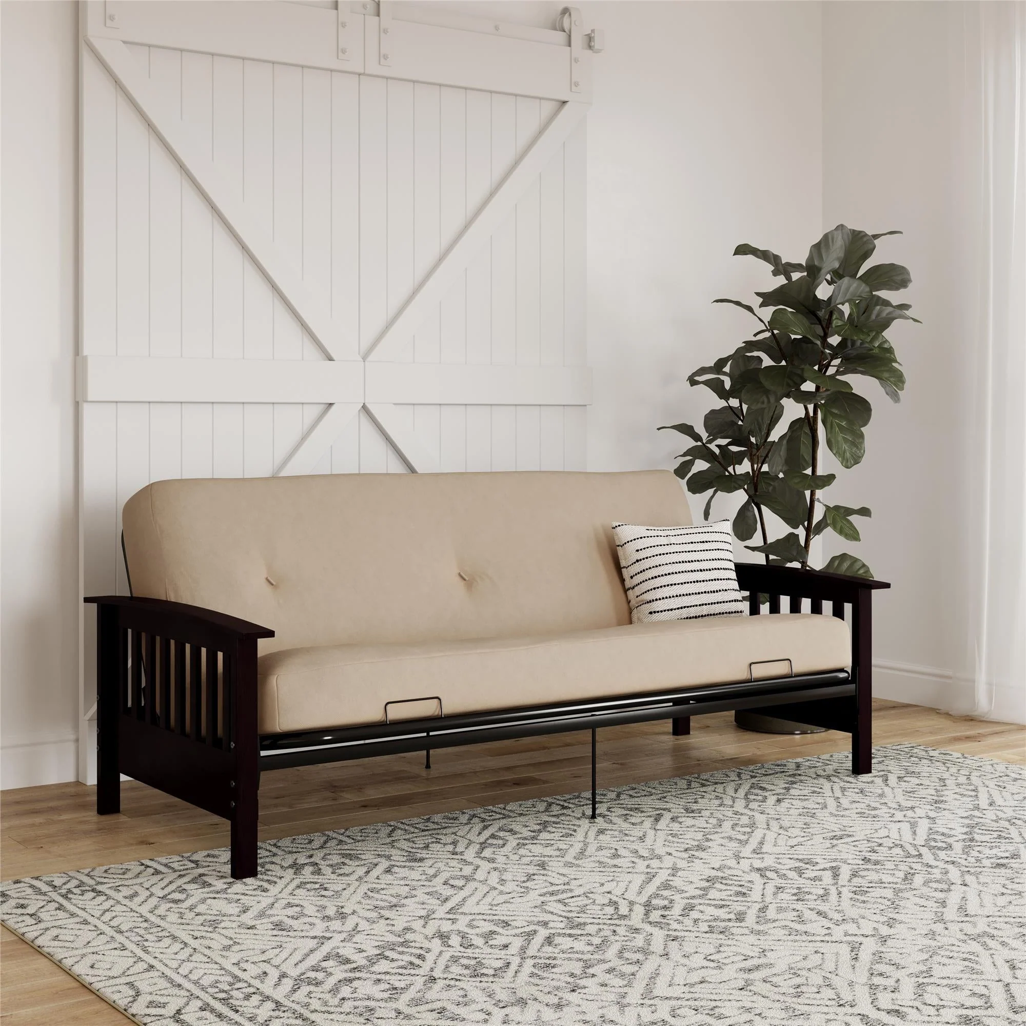DHP Darrien Full Size Espresso Wood Arm Futon Frame with 6" Thermobonded High Density Polyester Fill Tan Microfiber Mattress