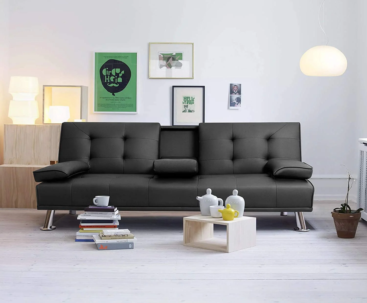 Lacoo Modern Faux Leather Convertible Futon with Cupholders & Pillows, 65" Black