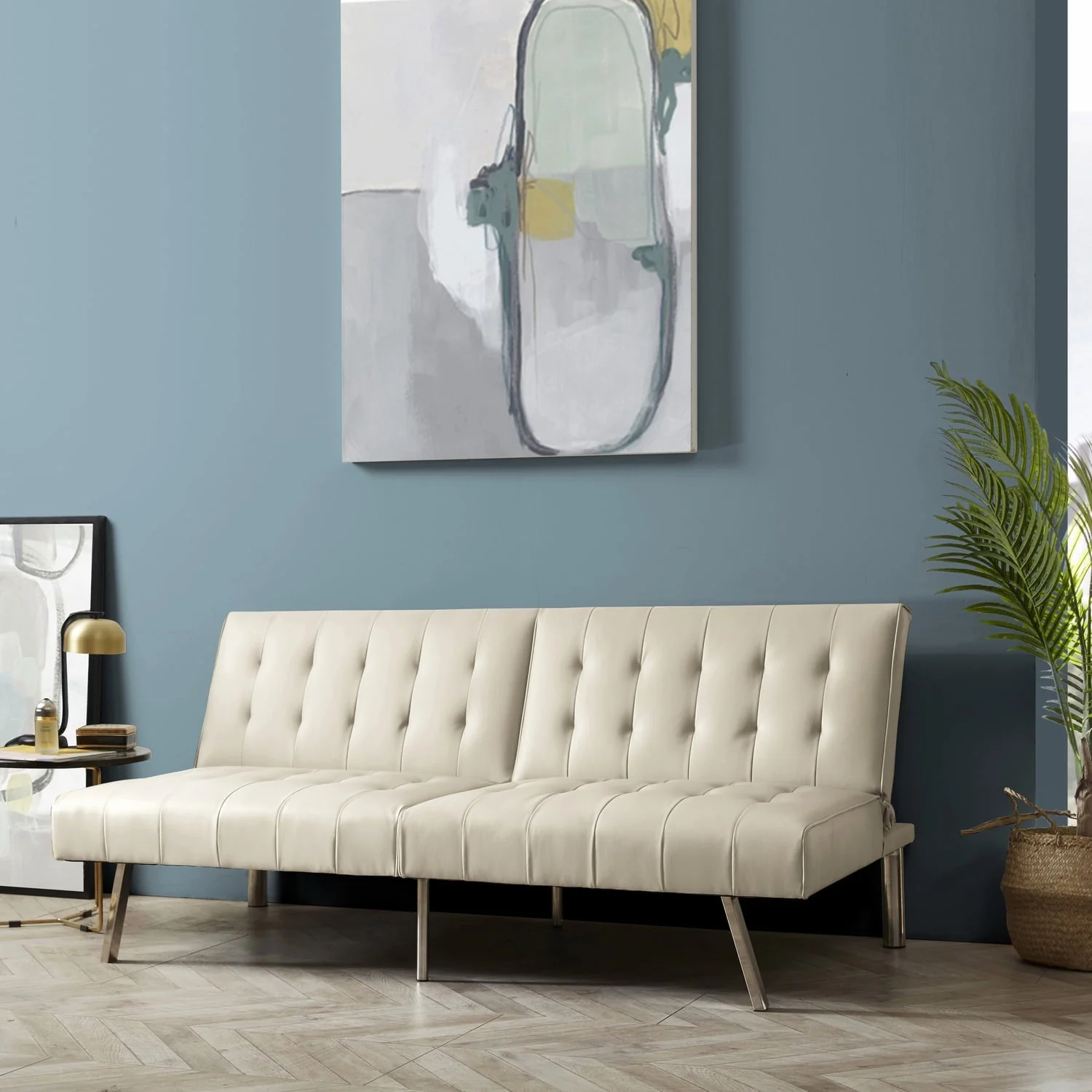 Tufted Split Back Futon Sofa by Naomi Home-Color:Cream,Style:Faux Leather