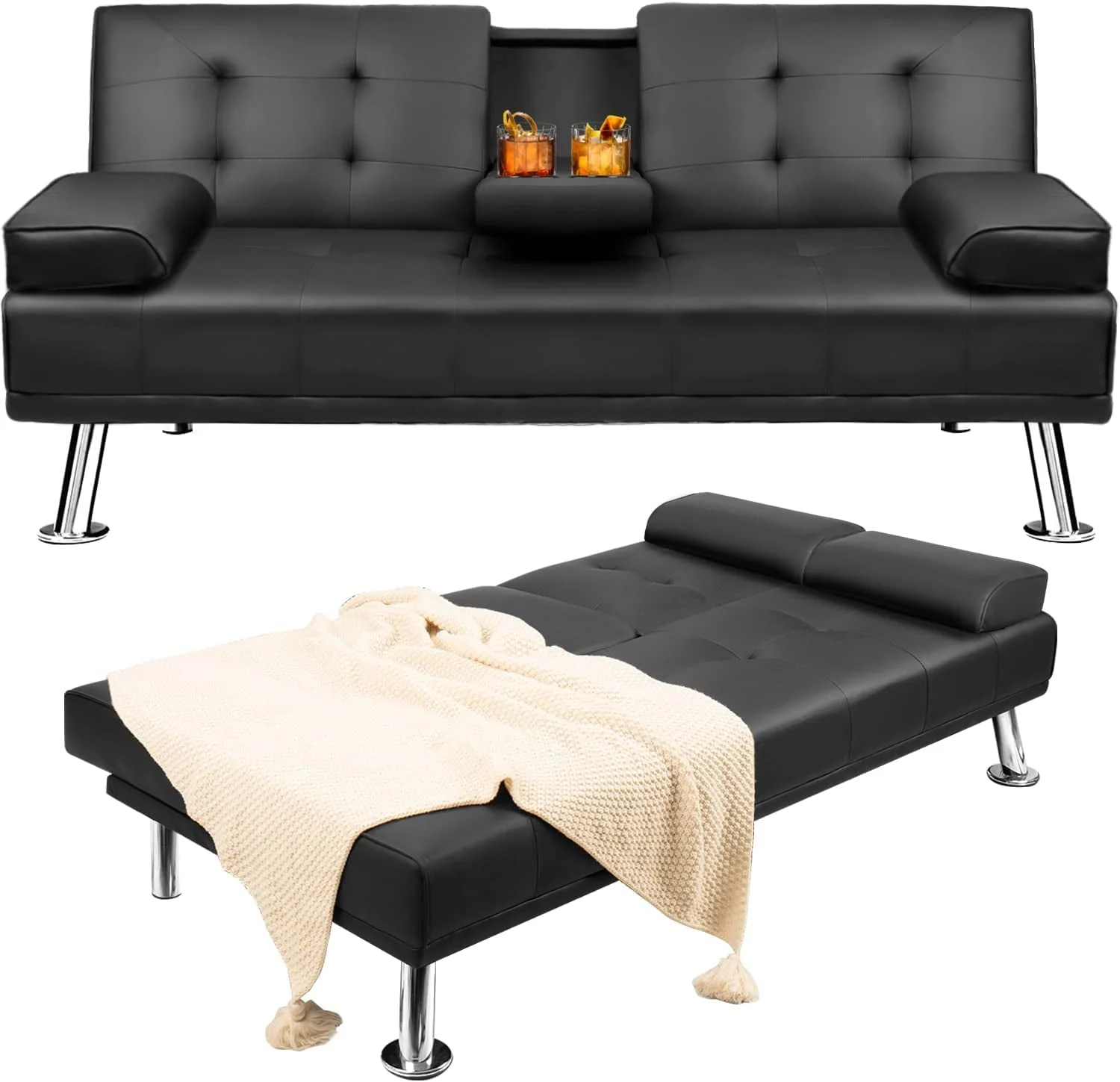 Vineego Modern Faux Leather Couch Convertible Folding Futon Sofa Bed with 2 Cup Holders, Black