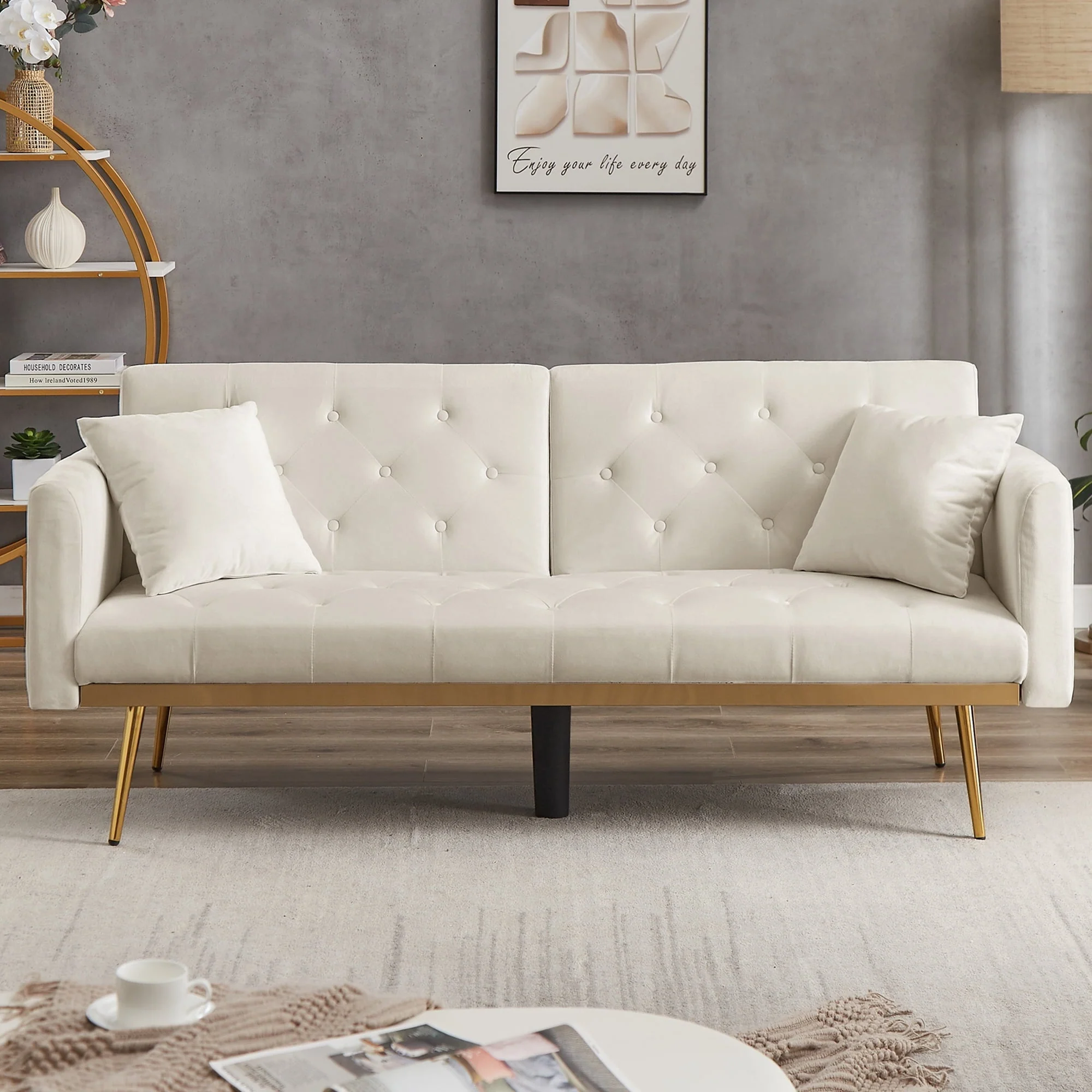 uhomepro Modern Futon, Velvet Sofa Bed, Mid Century Sofa with Metal Legs, 2 Pillows, Love Seat Living Room Furniture for Small Space Office, Beige