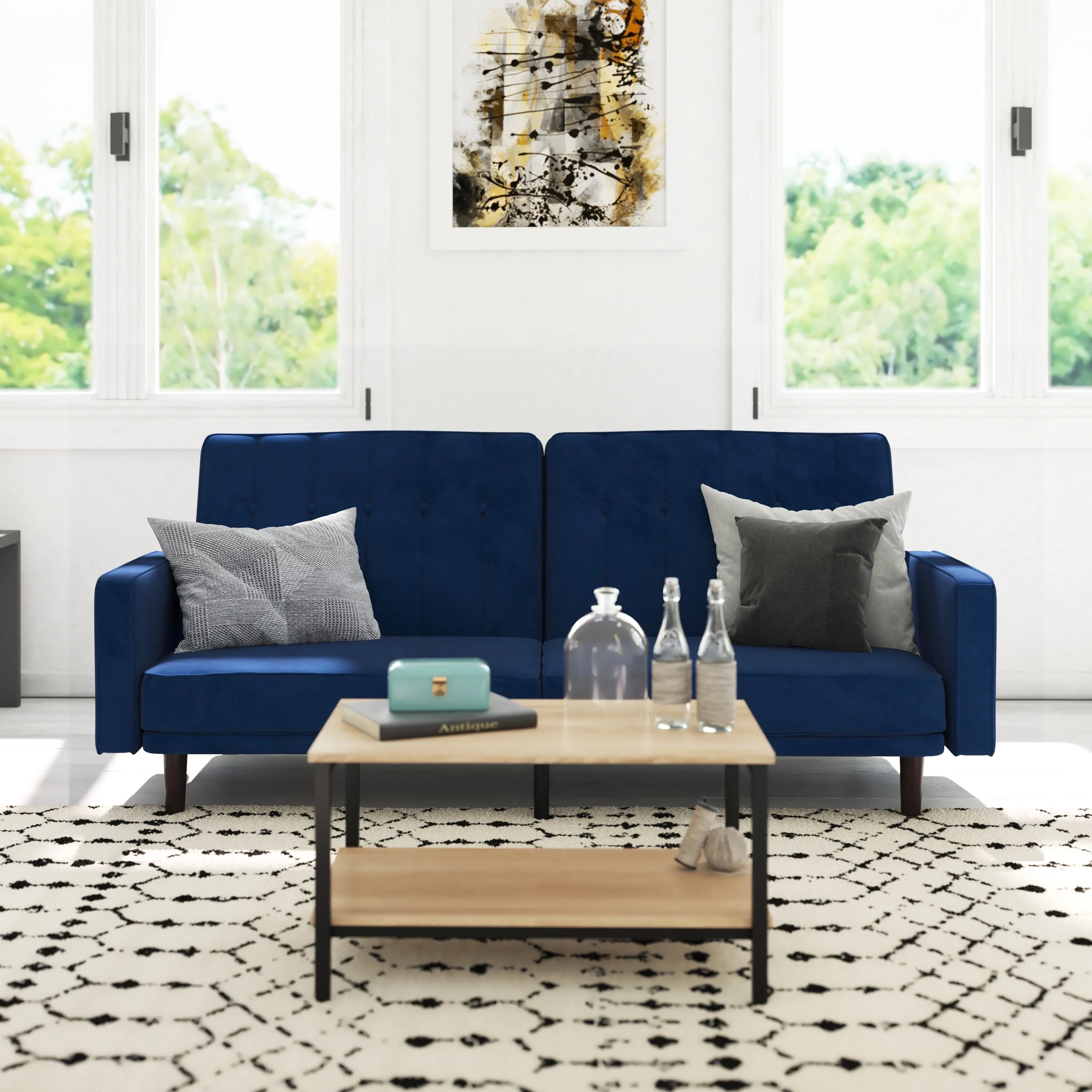 Emma + Oliver Plush Padded Velvet Upholstered Split Back Sofa Futon with Vertical Channel Tufting and Wooden Legs in Navy