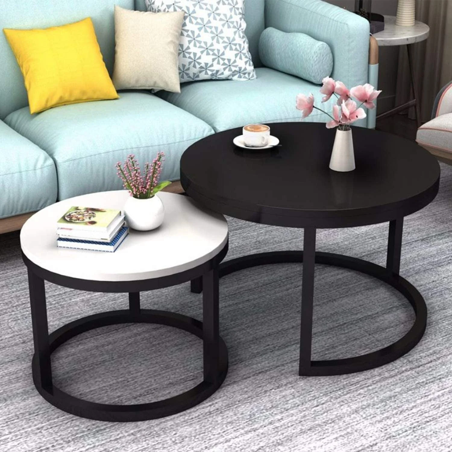 2 Round Tea Table Coffee Table Desk Sets | Black & White - Twin Sets Multi Function Wood & Steel Living Room Home Decor Polished Surface Overlapping Ending Tables Cocktail Table