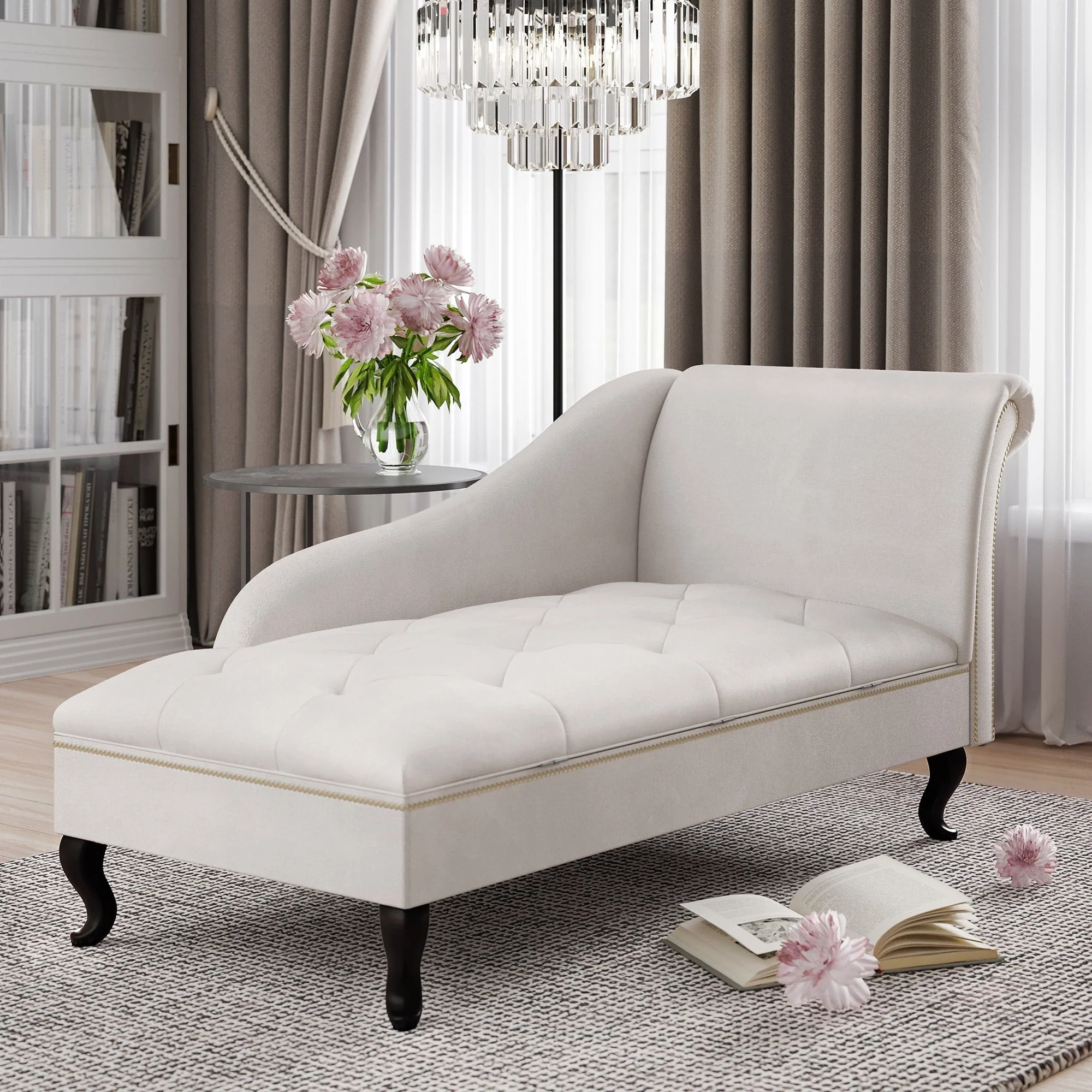 Belleze Nailhead Trim Velveteen Storage Chaise Lounge Chair Tufted Couch for Bedroom Living Room Fold Open Lid, Beige
