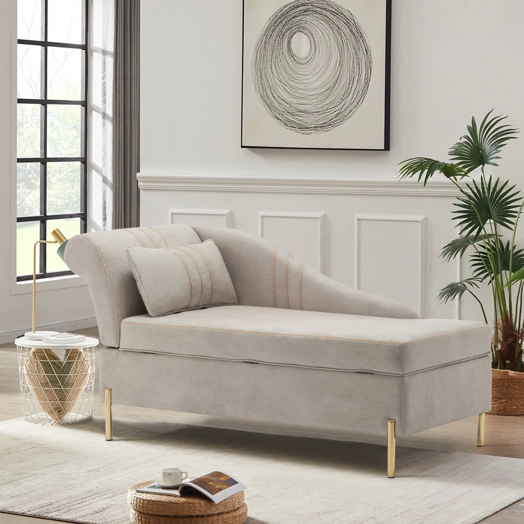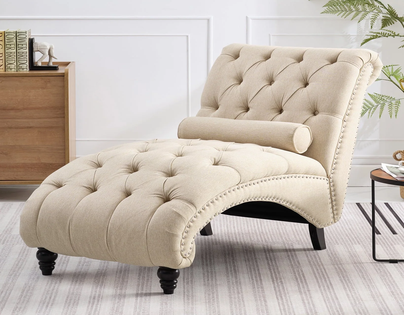 MUZZ Modern Velvet Chaise Lounge Indoor Chair,Tufted Long Lounge with Pillow for Living Room/Bedroom/Office(Beige)