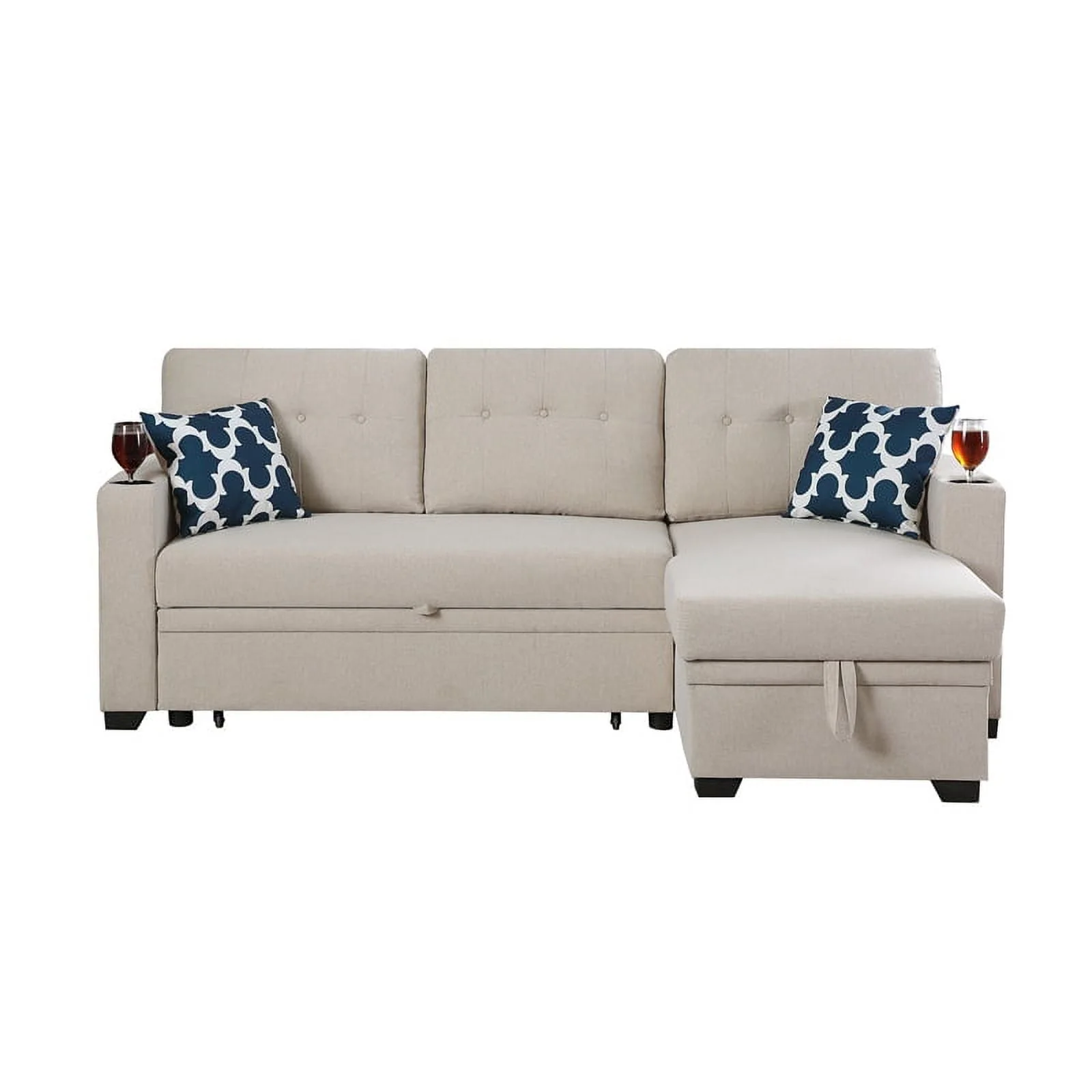 Reversible Fabric Sleeper Sofa Bed & Chaise with Cup Holder-Beige