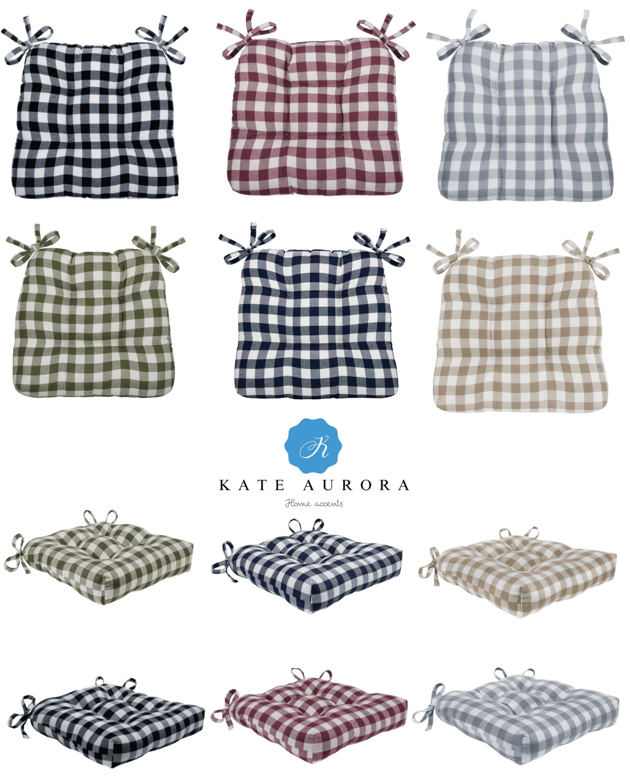 Kate Aurora Country Living Plush Gingham Plaid Checkered Country Farmhouse Chair Cushions, Pads With Tear Proof Ties - Assorted Colors