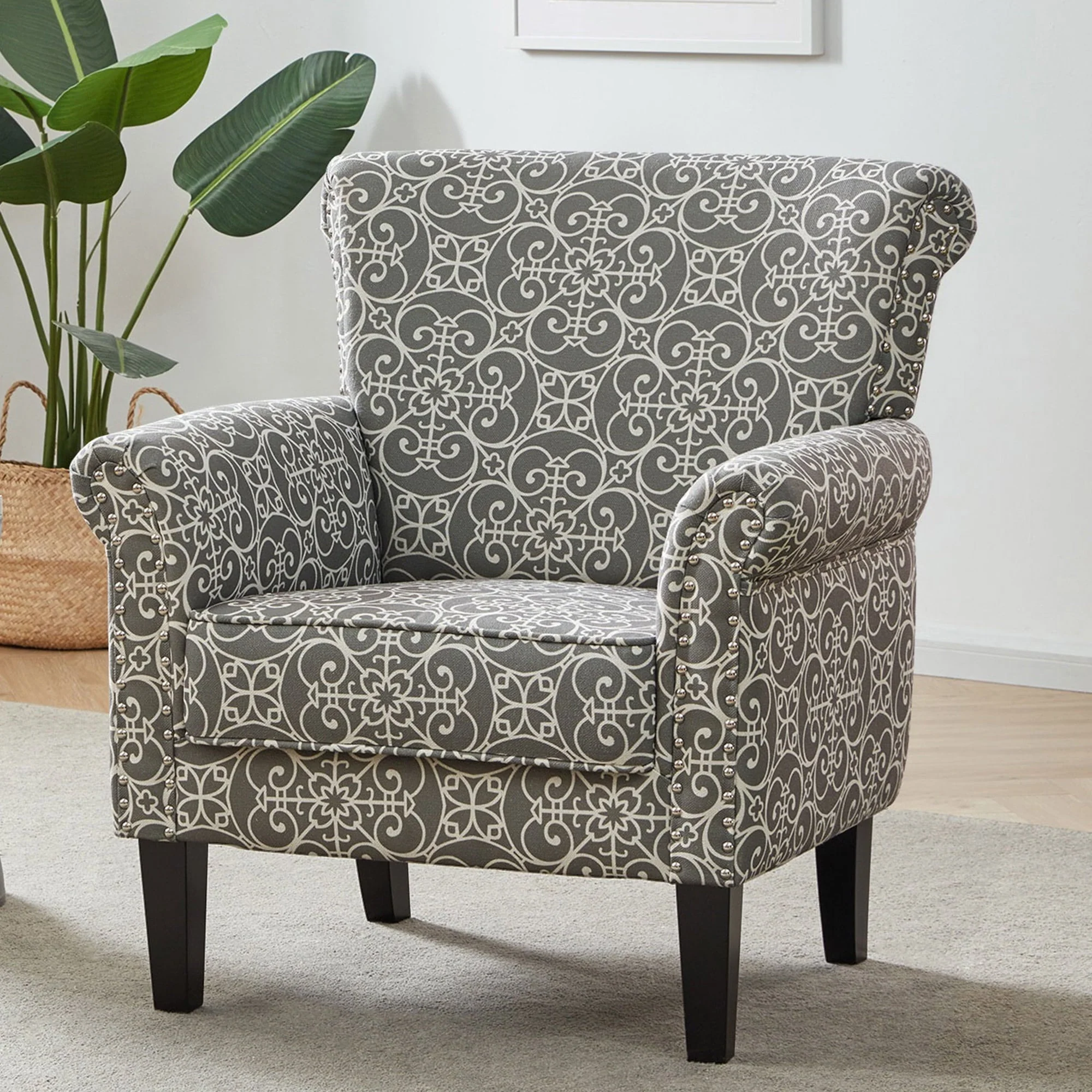 BELLEZE Rosette Scroll Arm Fabric Upholstered Club Chair Nailhead Trim Accent Chair, Gray
