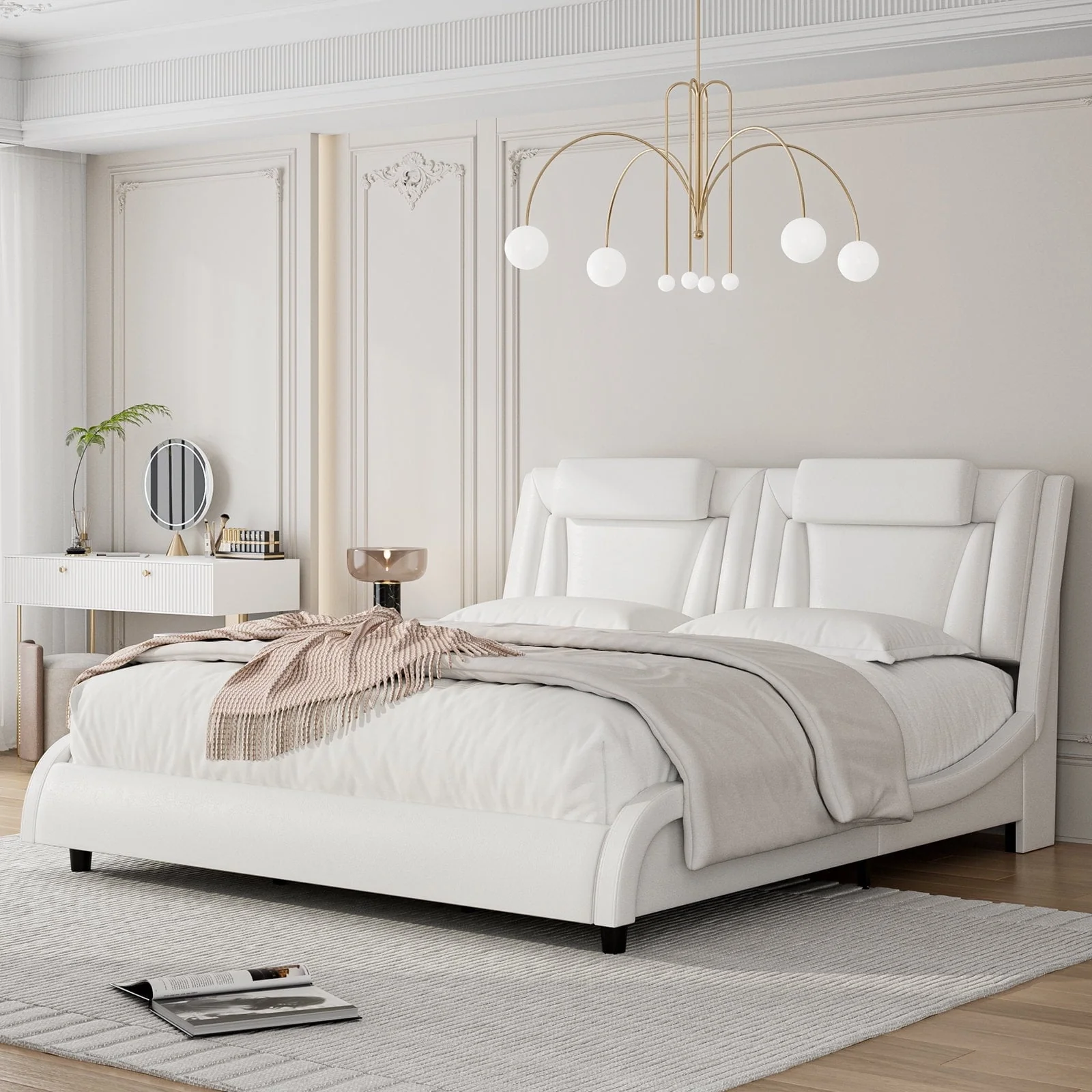 Homfa Queen Size LED Bed Frame, PU Leather Curved Upholstered Platform Bed with Adjustable Headboard and Pillow, White