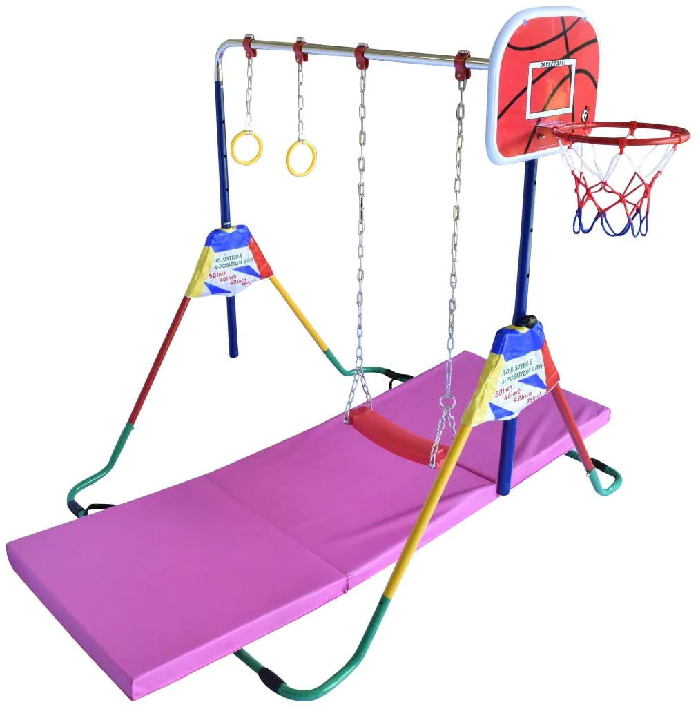 Adjustable Height Gymnastics Bar for Kids Kip Bar 6 in 1 Set, 6'x2' Gymnastic Tumble Mat, Swing Seat, 2 Trapeze Rings, Basketball Hoop, Home Junior Training Monkey Bars Fitness Balance Horizontal Bar