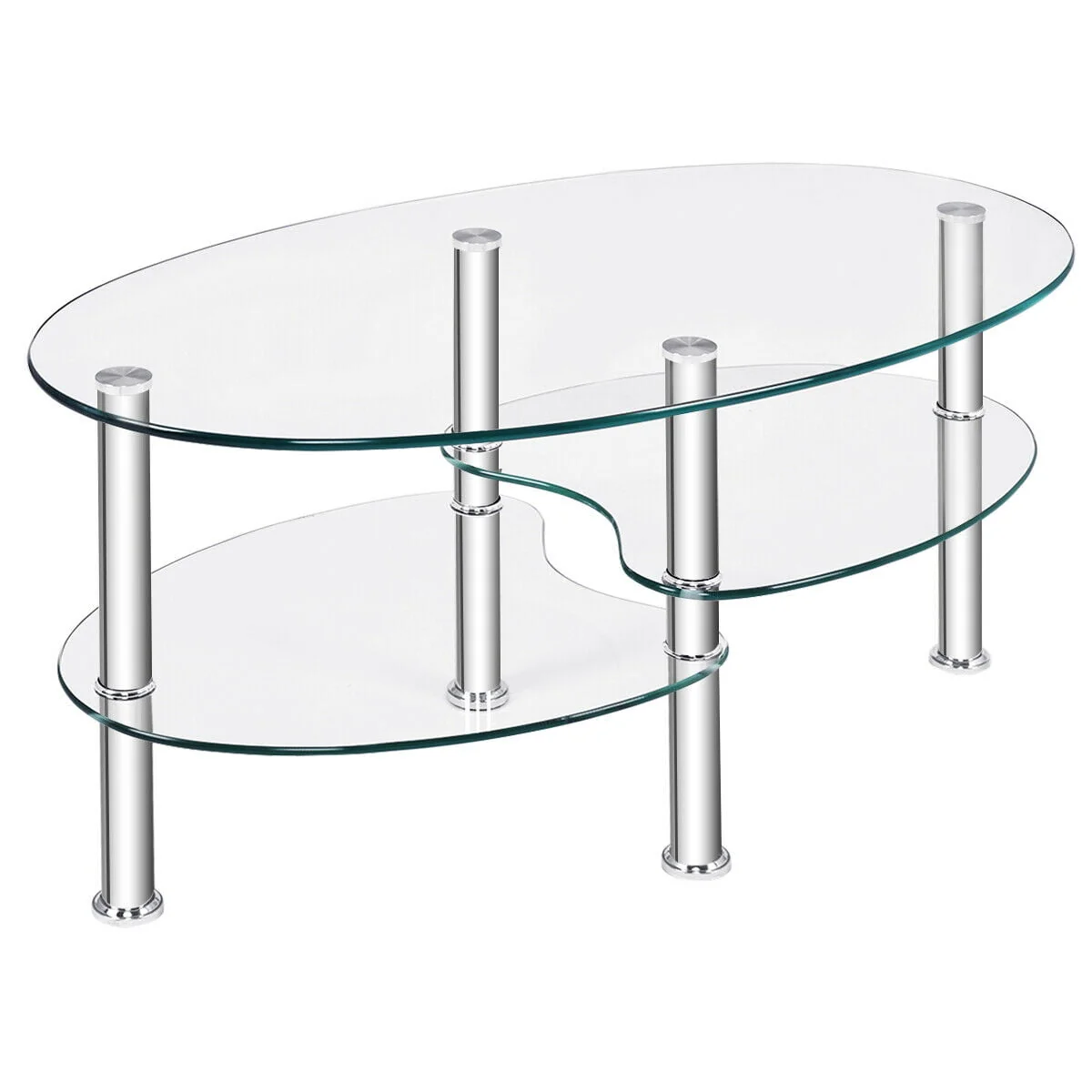 Costway Tempered Glass Oval Side Coffee Table Shelf Chrome Base Living Room Clear