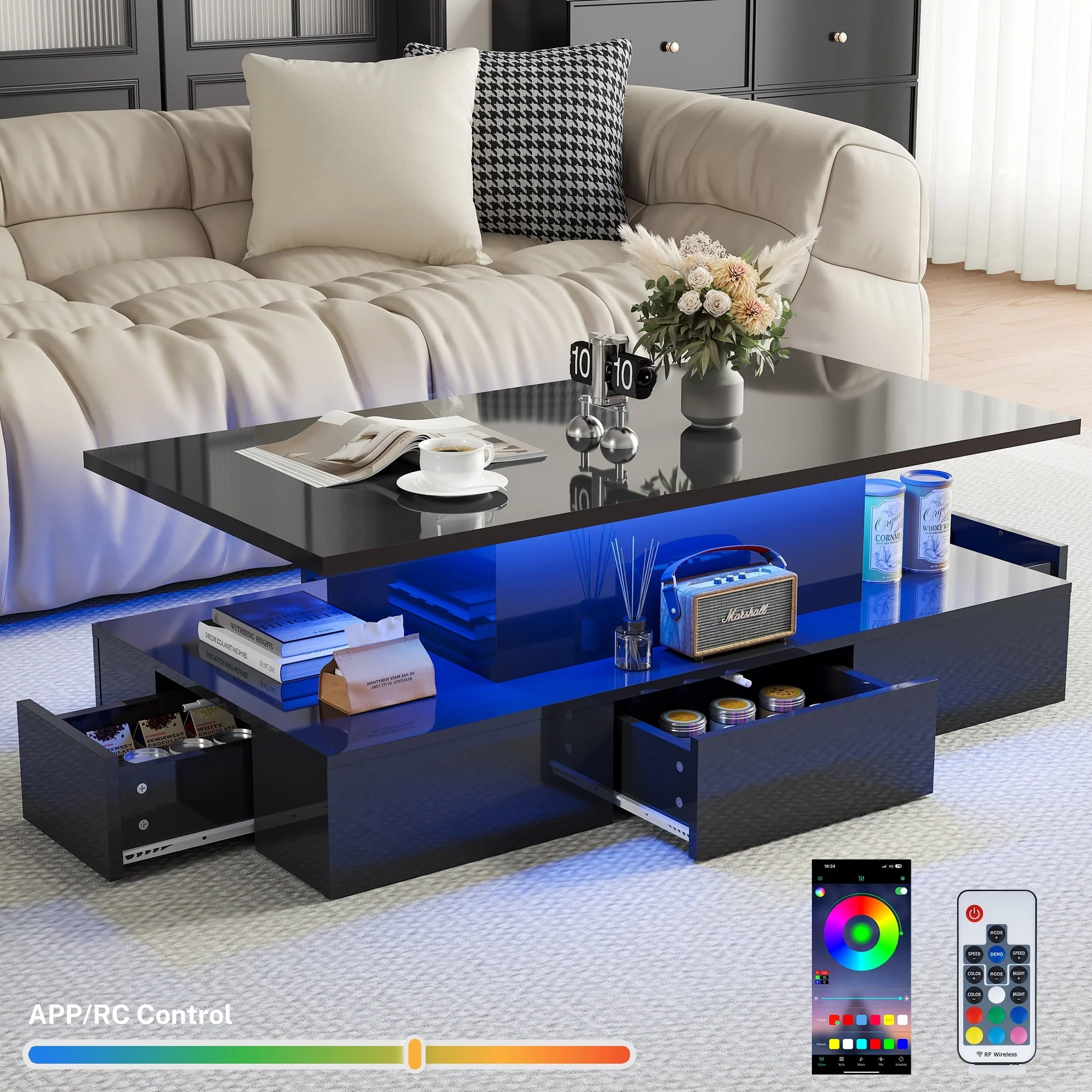 HSUNNS Black LED Coffee Table for Living Room, Modern High Glossy Center Table with 4 Drawers, Smart Cocktail Table Rectangle, Sofa Side Tea Tables with LED Lights, 40" L×24" W×15" H