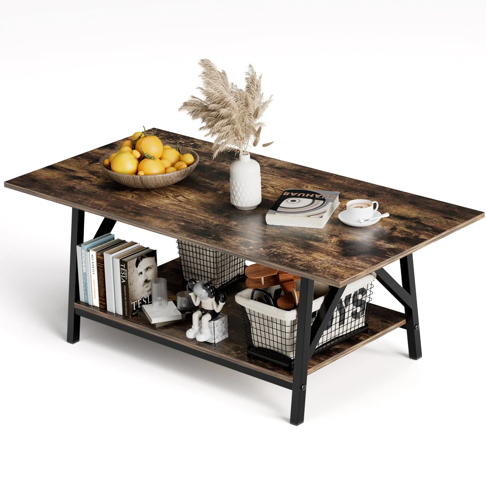 47" Industrial Coffee Table for Living Room, Desk, Retro Wooden Cocktail Table with Storage Shelf, Rustic Brown