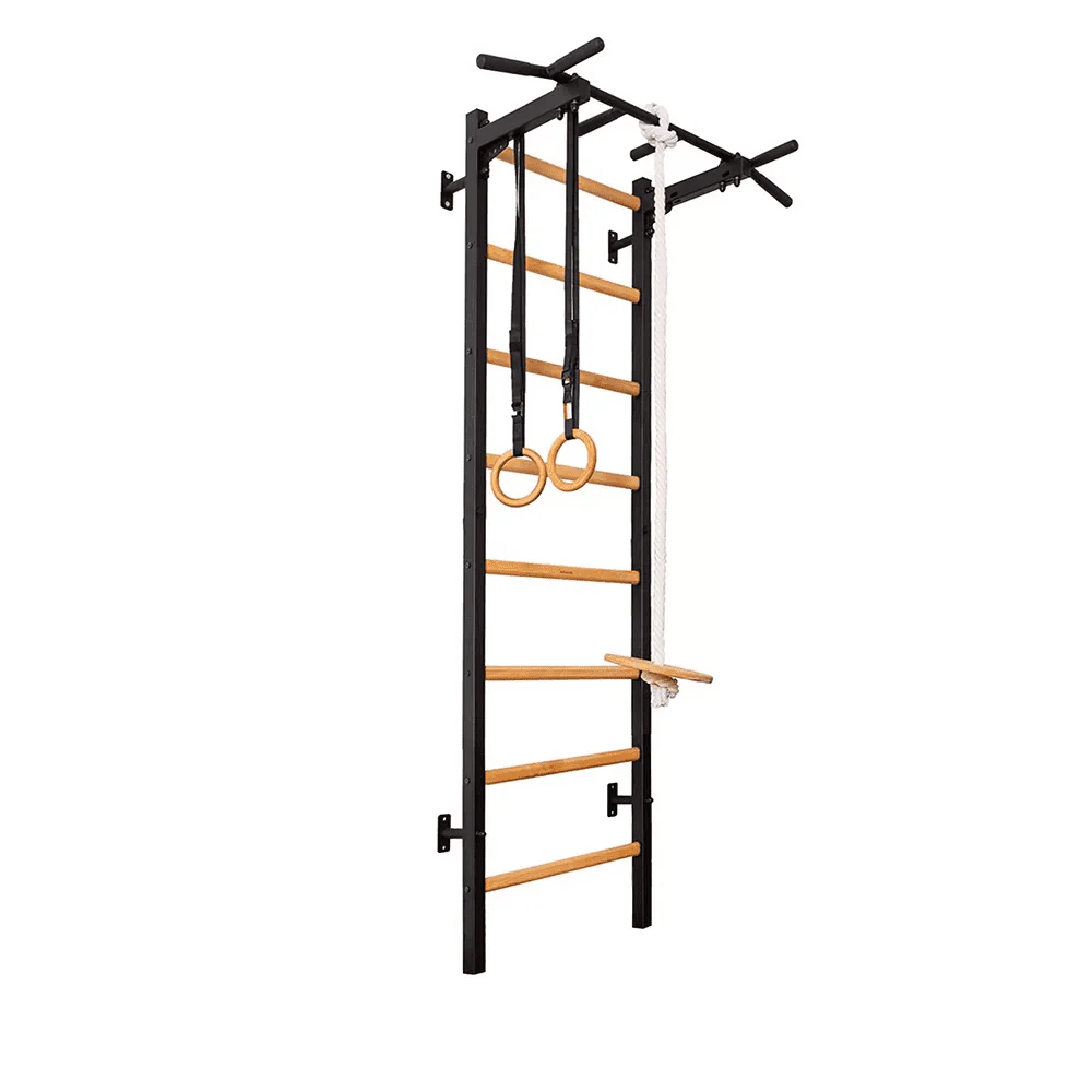 BenchK 221 Black + A076 Wall bars with adjustable beech wood pull-up bar and gymnastic accessories