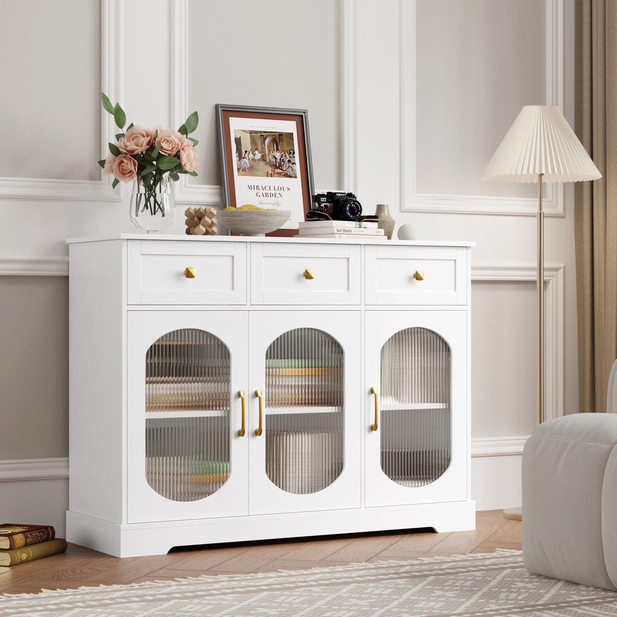 Homfa 3 Drawer Buffet Cabinet with 3 Curved Glass Doors, 47.2''W Kitchen Sideboard with Adjustable Shelf, White