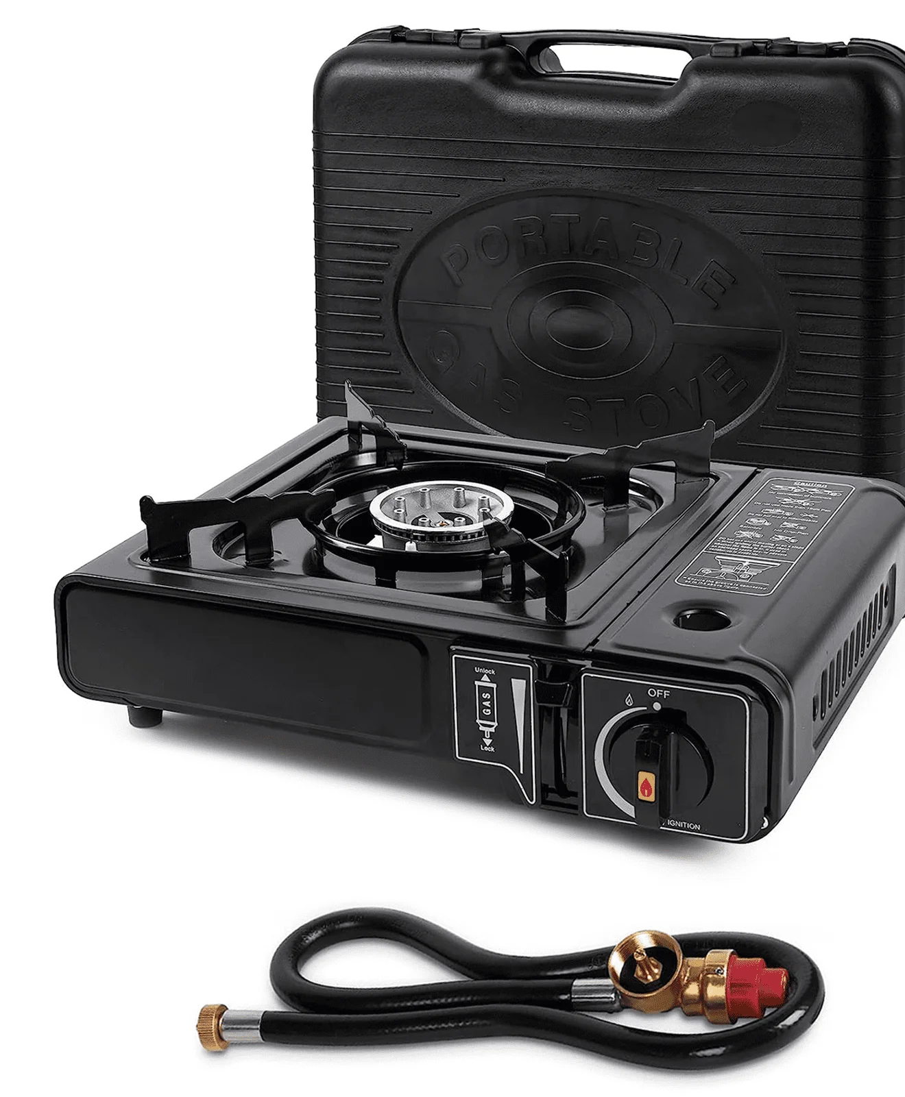 Portable Dual Fuel Gas Stove for Camping and Outdoor Cooking with Butane & Propane Compatibility, Propane Adapter Hose and Carrying Case Included, 7800 BTUs Output
