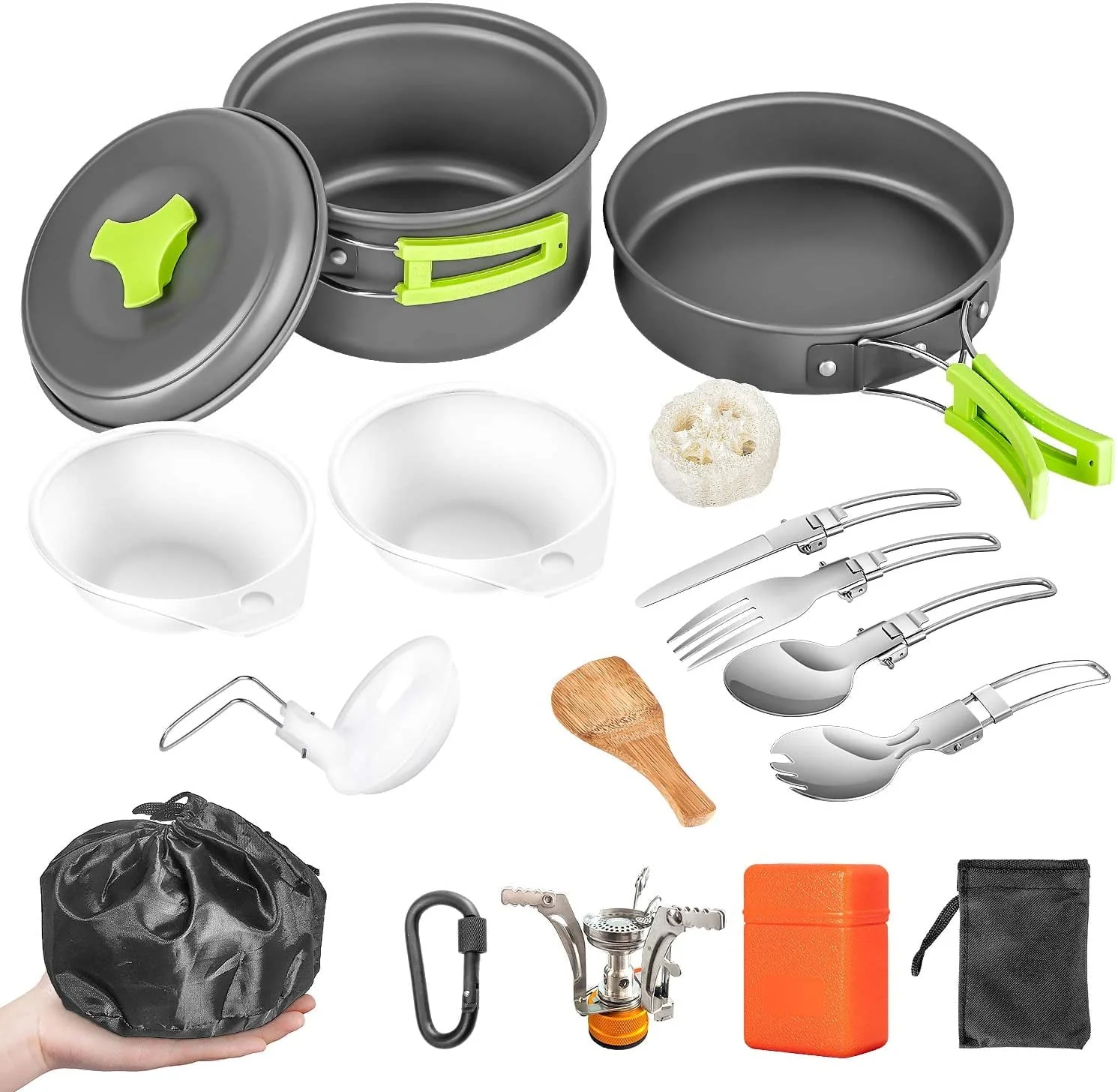 16 Pcs Camping Cookware Set Stove Canister Stand Tripod Outdoor Hiking Picnic Non-Stick Cooking Backpacking with Folding Knife and Fork Set Mess Kit