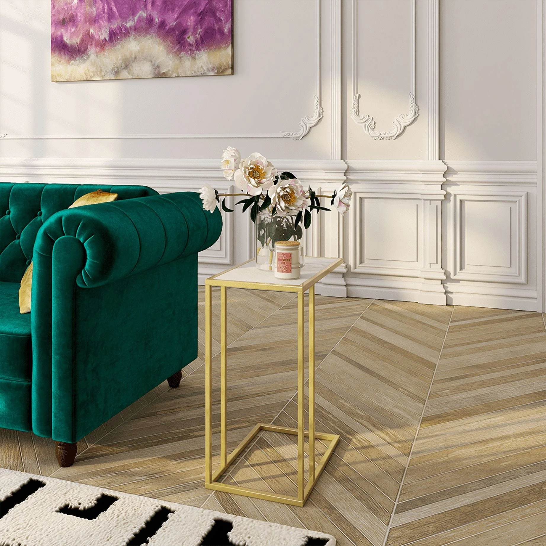 Ember Interiors Modern Wood and Metal C-Shaped End Table, Set of 2, Faux White Marble/Gold