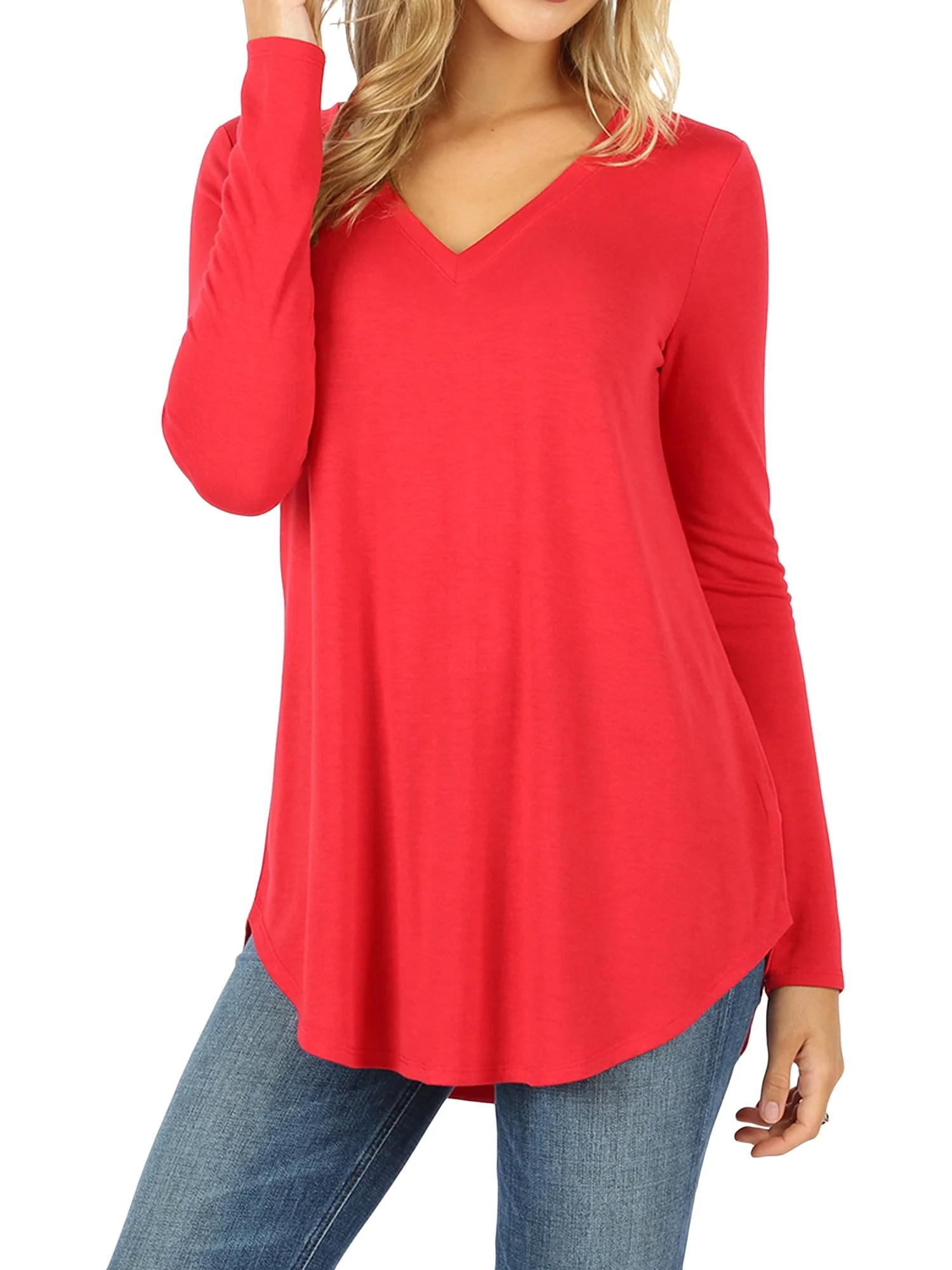 Zenana Women & Plus Relaxed Fit Long Sleeve V-Neck Round Hem Jersey Tee Shirt Top
