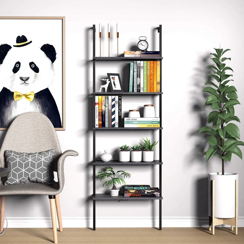 Zimtown 5-Shelf Wood Bookcase and Bookshelf, Wall Mounted Learning Ladder Display Rack, Black Finish