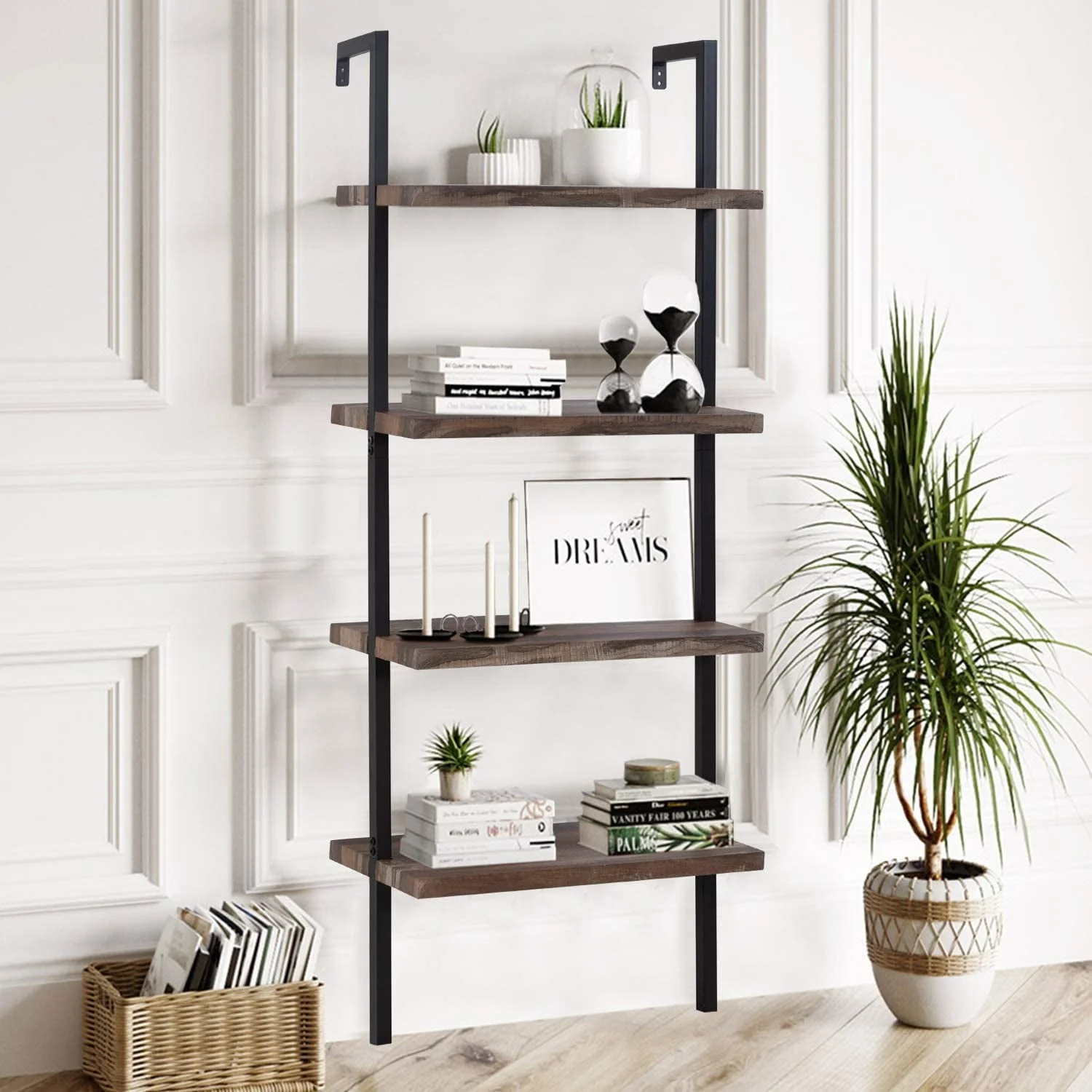 FDW 4-Shelf Bookcase Open Wall Mount Ladder Bookshelf with Industrial Metal Frame For Home Office Study, 60-inch