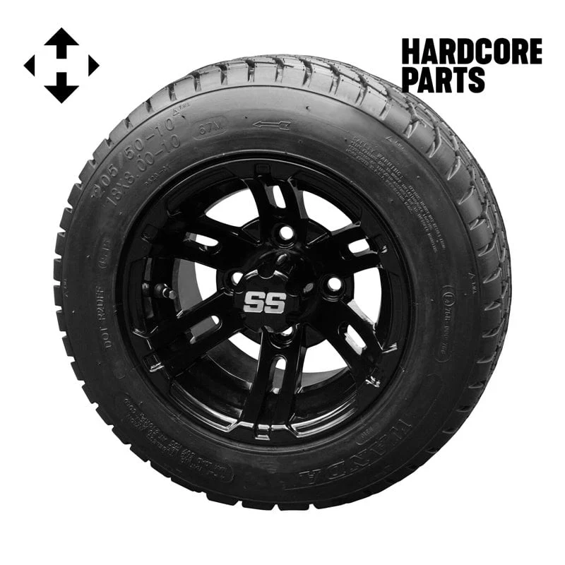 Hardcore Parts 10" Black 'BULLDOG' Golf Cart Wheels and 205/50-10 (18"x8"-10") DOT rated Low Profile tires - Set of 4, includes Black 'SS' center caps and 1/2x20 Black lug nuts
