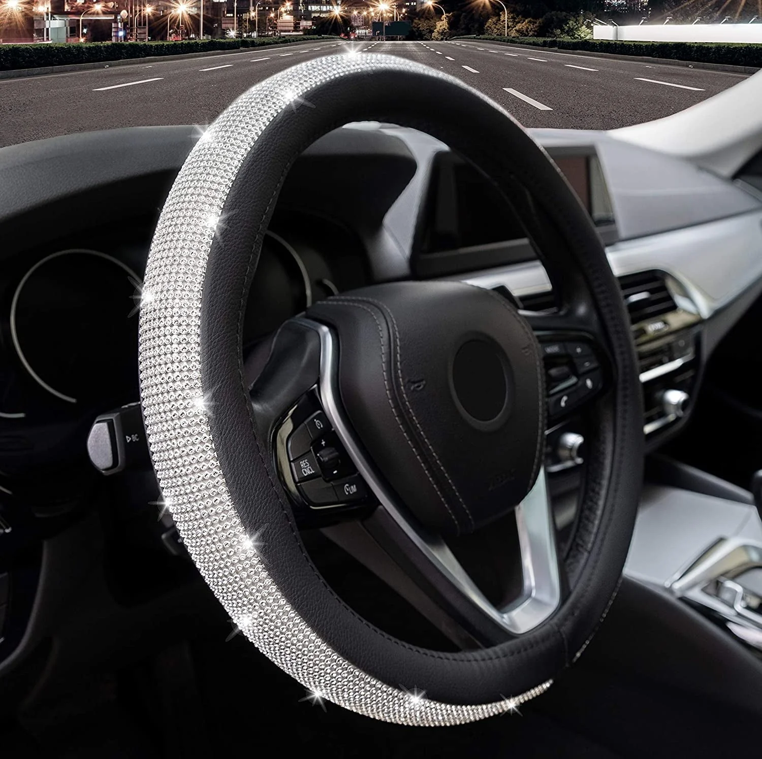 BAMILL Car Bling Steering Wheel Cover for Women Girls,15inch Universal Crystal Rhinestone Bling Anti-Slip Wheel Protector