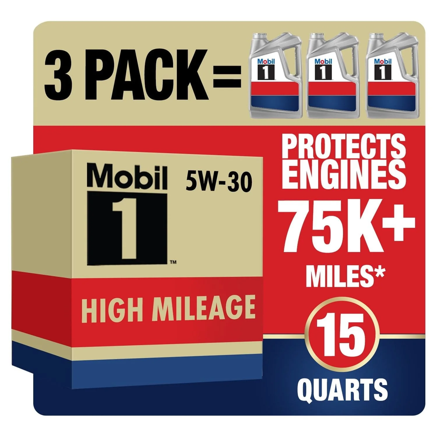 Mobil 1 High Mileage Full Synthetic Motor Oil 5W-30, 5 qt (3 Pack)