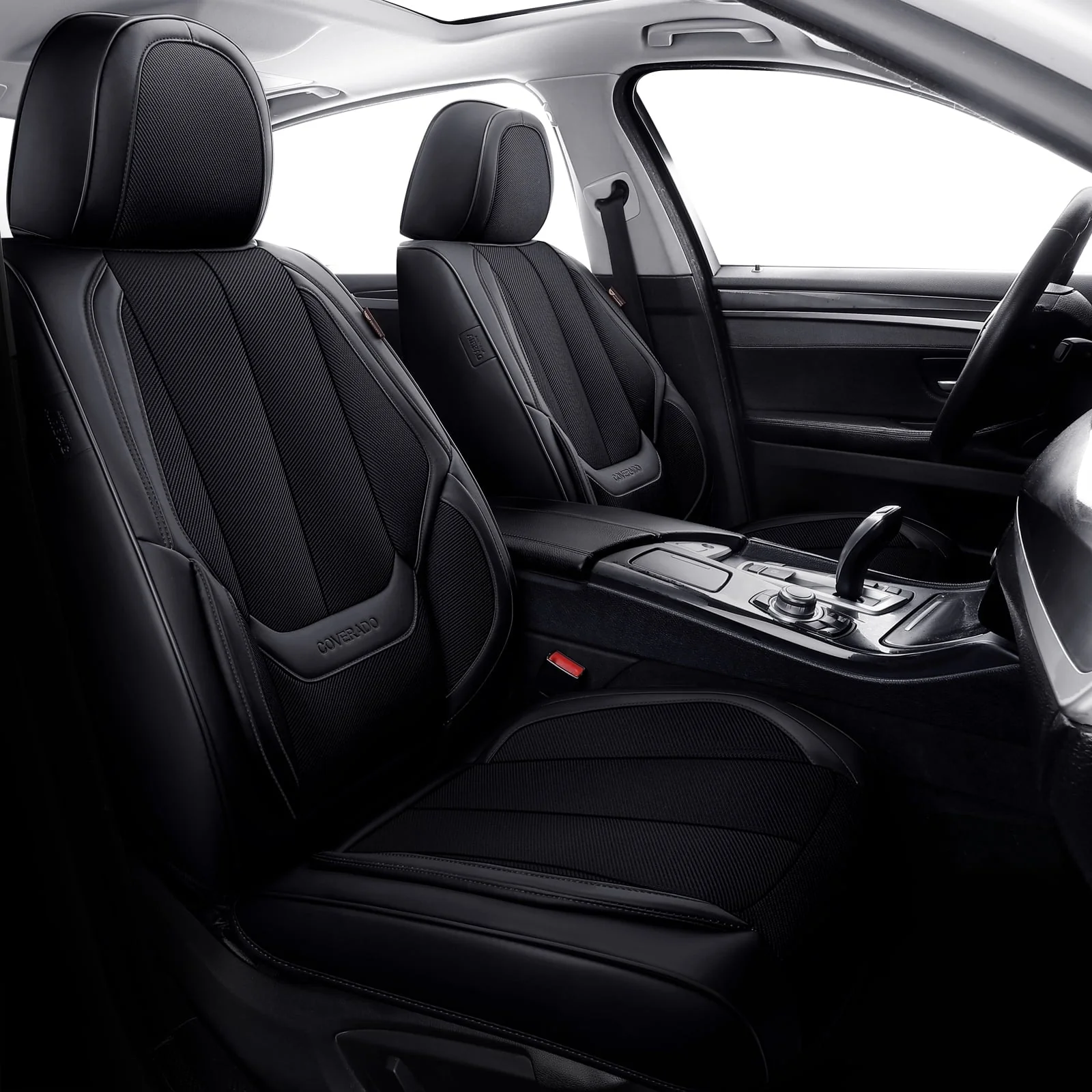 Coverado Front Seat Covers 6 Pieces,Breathable Fabric&Leather Car Seat Protectors,Universal Auto Accessories Compatible with Most Sedans SUV Pick-up Truck,Black