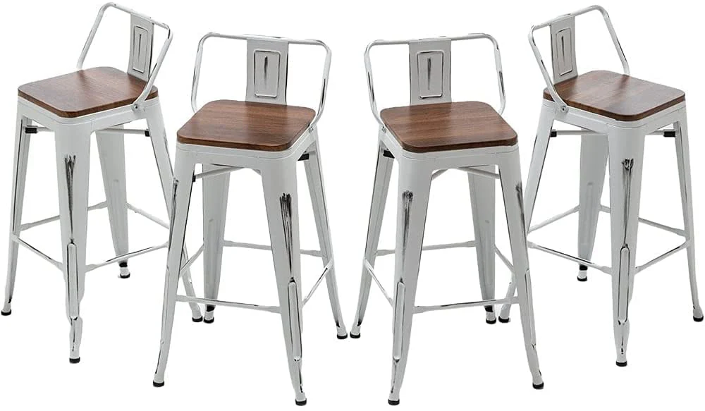 Andeworld Bar Stools Set of 4 Counter Height Stools Industrial Metal Barstools with Wooden Seats( 24 Inch, Distressed White )