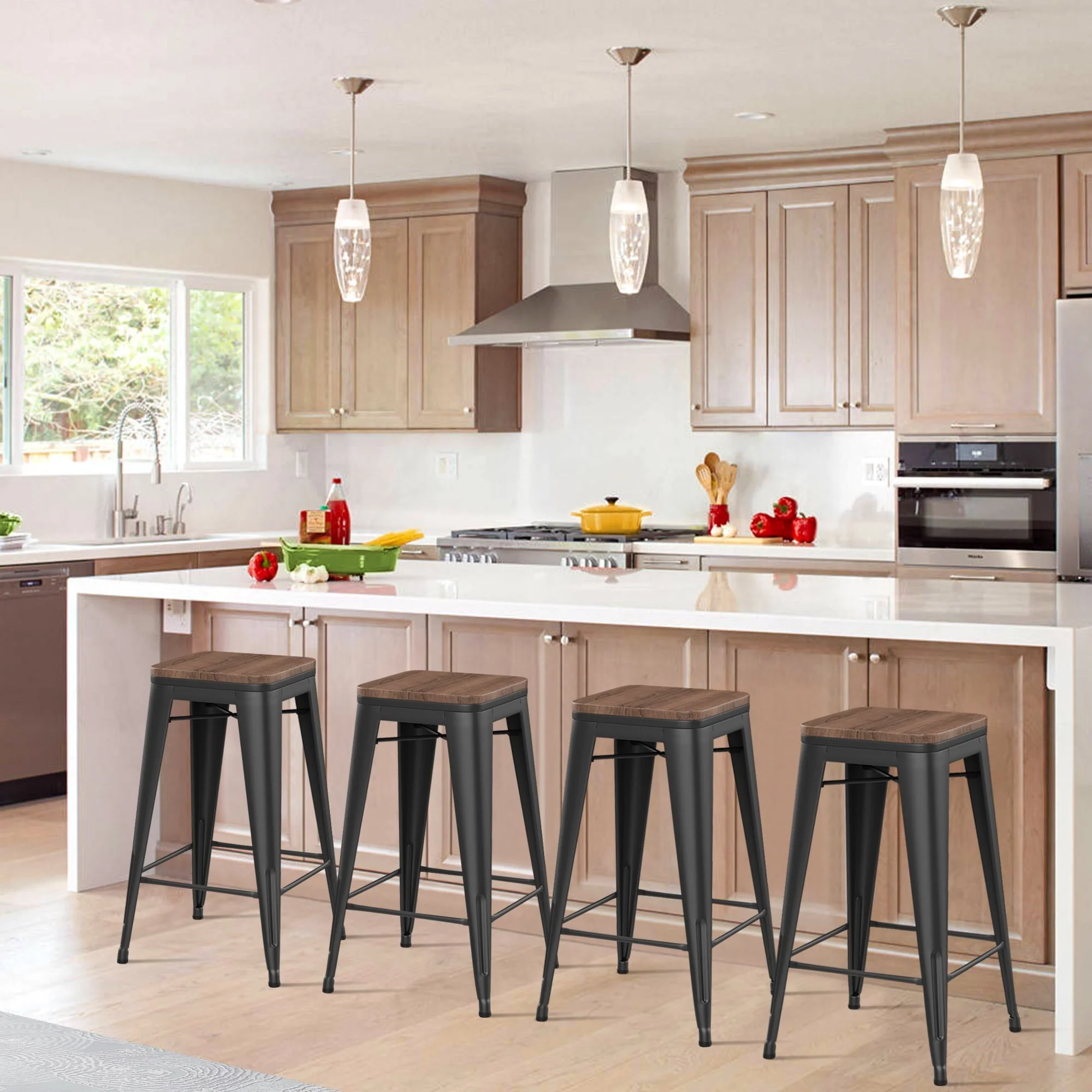 Andeworld 26" Set of 4 Metal Bar Stools Stackable Counter Height Barstools Wood Seat Backless Rustic Kitchen Bar Chairs (Black)
