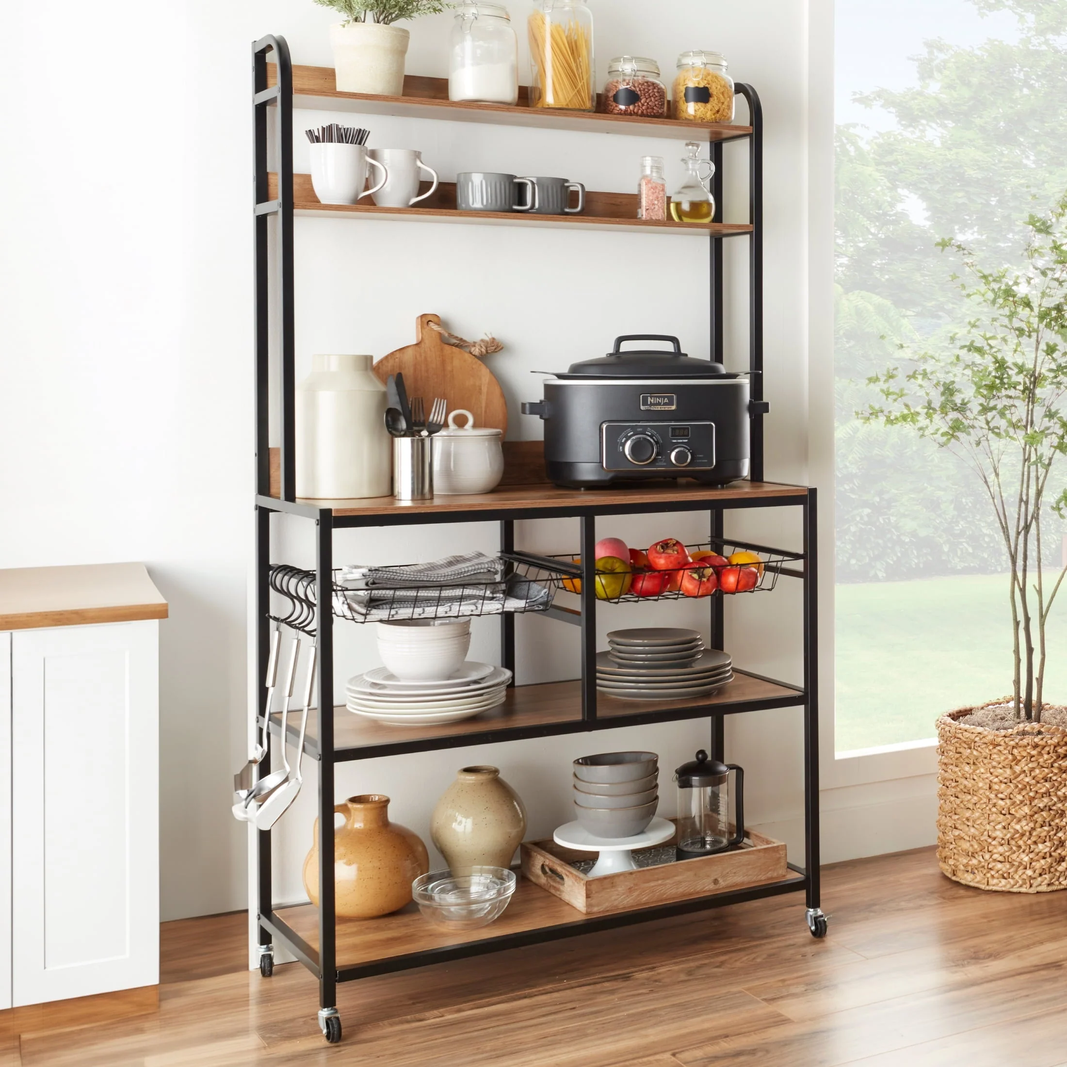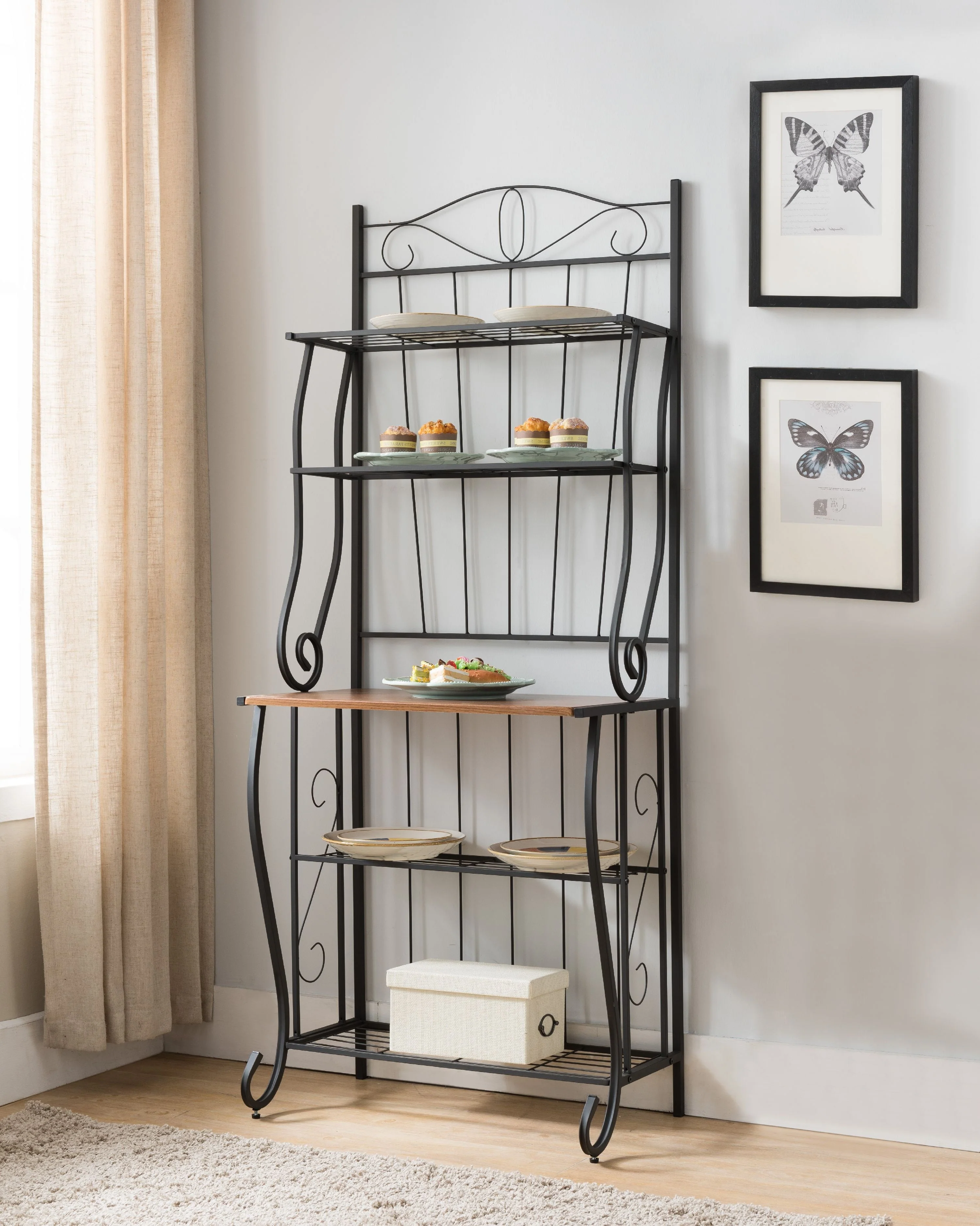 Bian Black Metal & Walnut Wood Transitional 5 Tier Storage Kitchen Bakers Organizer Rack Display Stand