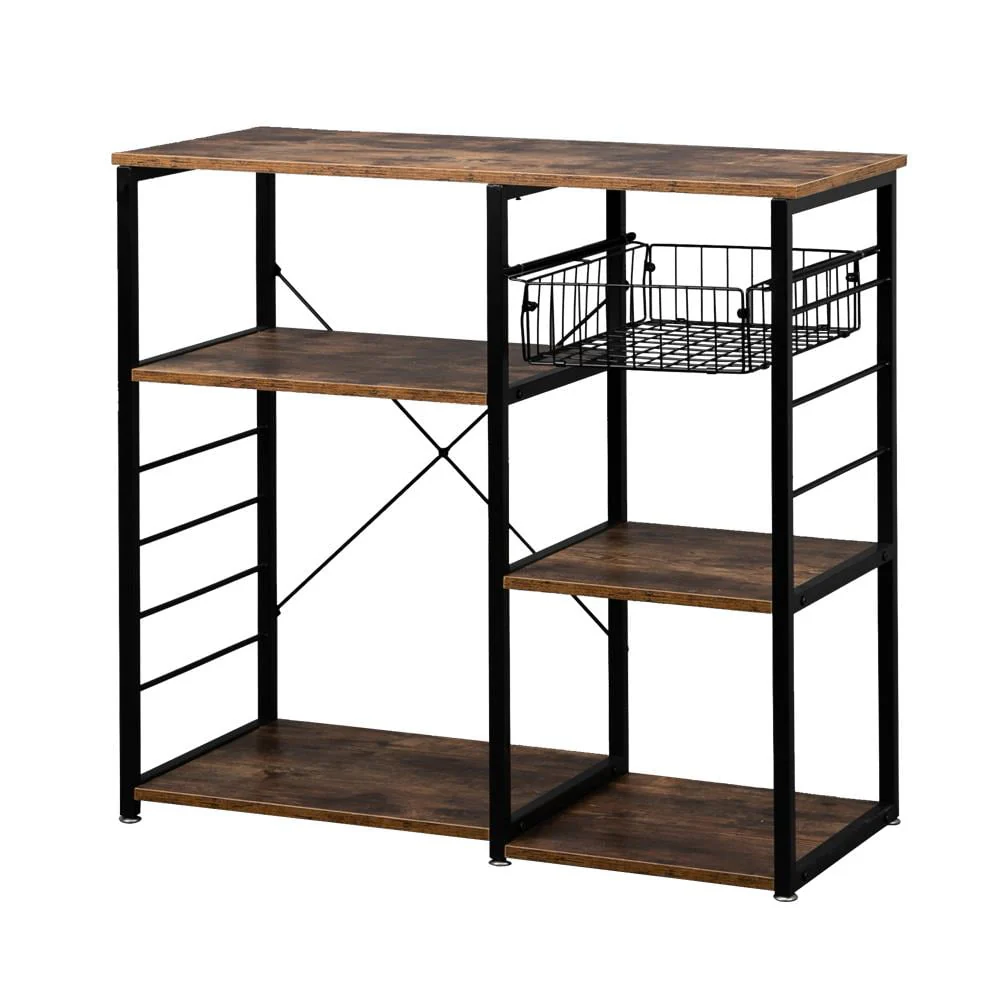 UbesGoo 4-Layer Kitchen Microwave Oven Stand Baker's Rack Storage Shelf Organizer with Basket and Hooks, Dark Brown