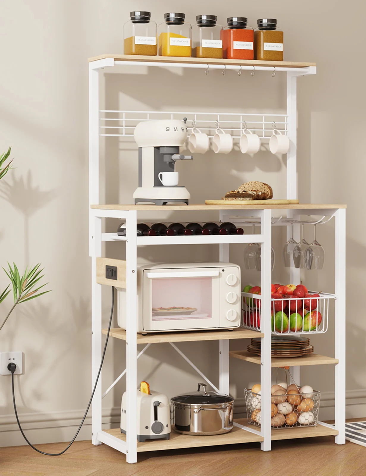 KERROGEE 5 tiers Standing Baker's Racks with Wood Table, Utility Storage Shelf, Kitchen Microwave Oven Stand Cart, Kitchen Organizer Rack, Beige
