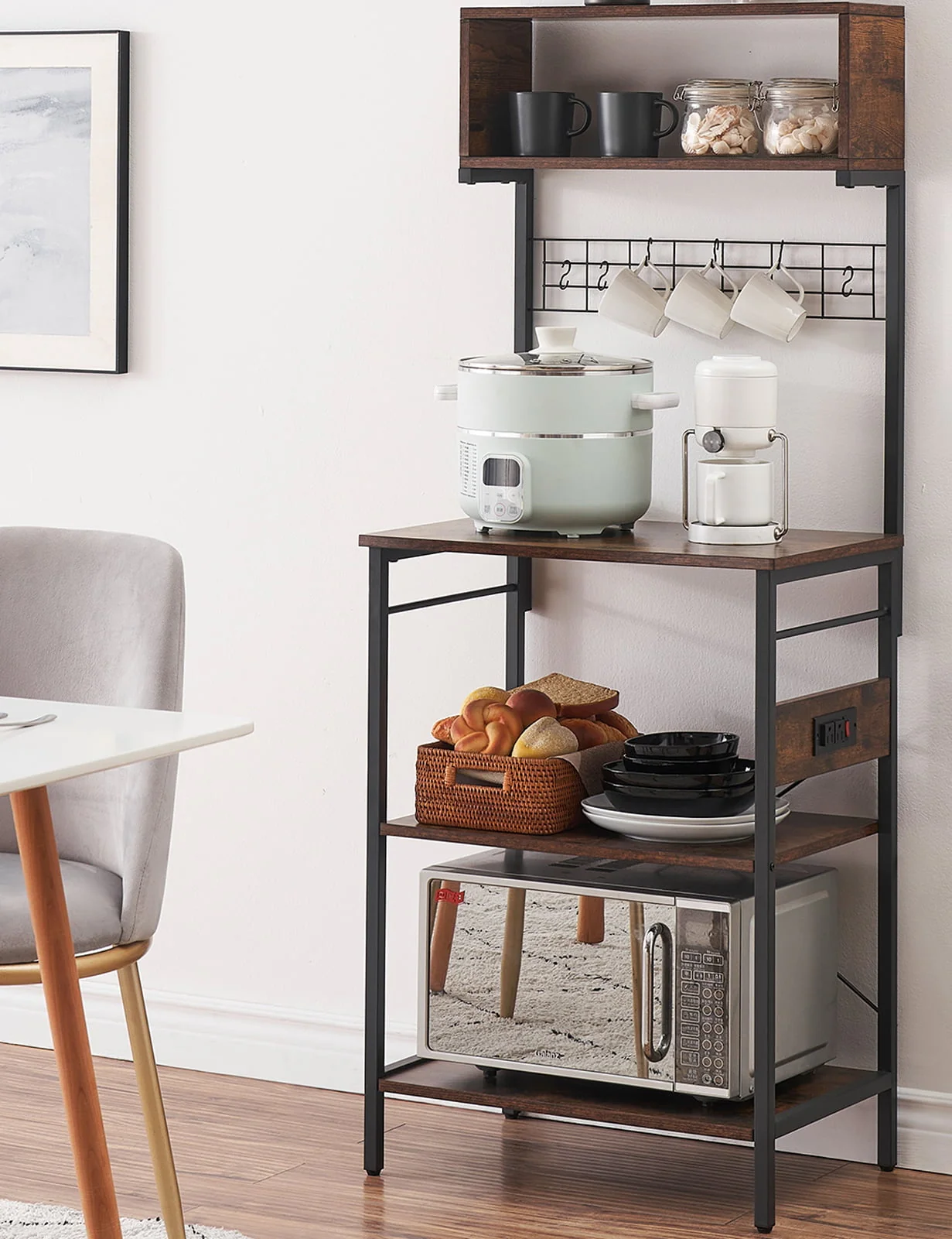 SUPERJARE Bakers Rack with Power Outlet, Kitchen Coffee Bar Table, Wood Microwave Stand with Hooks and Storage Shelves, Kitchen Shelf Rack, Rustic Brown