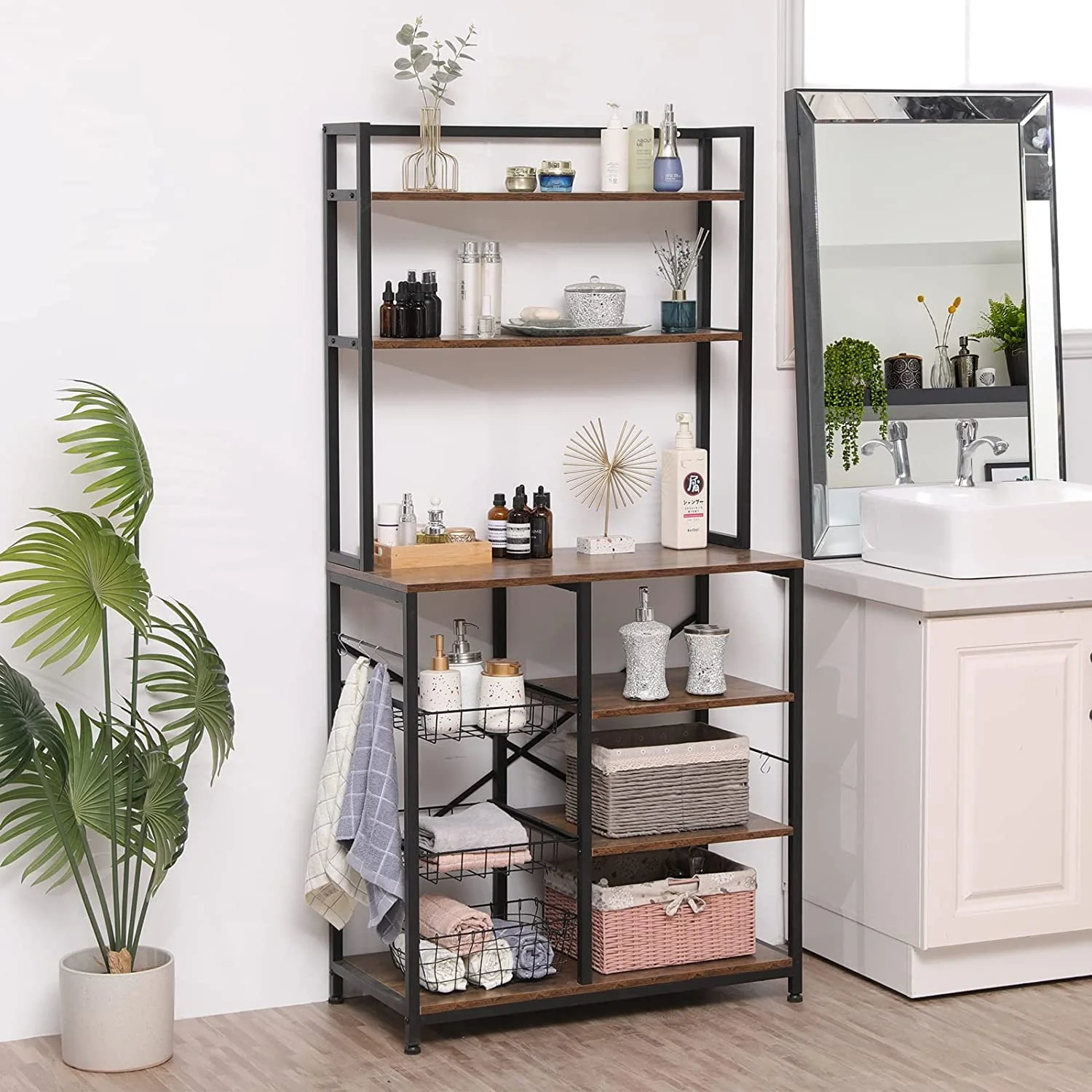 EnHomee 6 Tier Kitchen Bakers Rack Microwave Oven Stand with Storage Coffee Bar with Shelves Cabinet Hooks, 29.5" W * 13.9" D * 63" H Rustic Brown