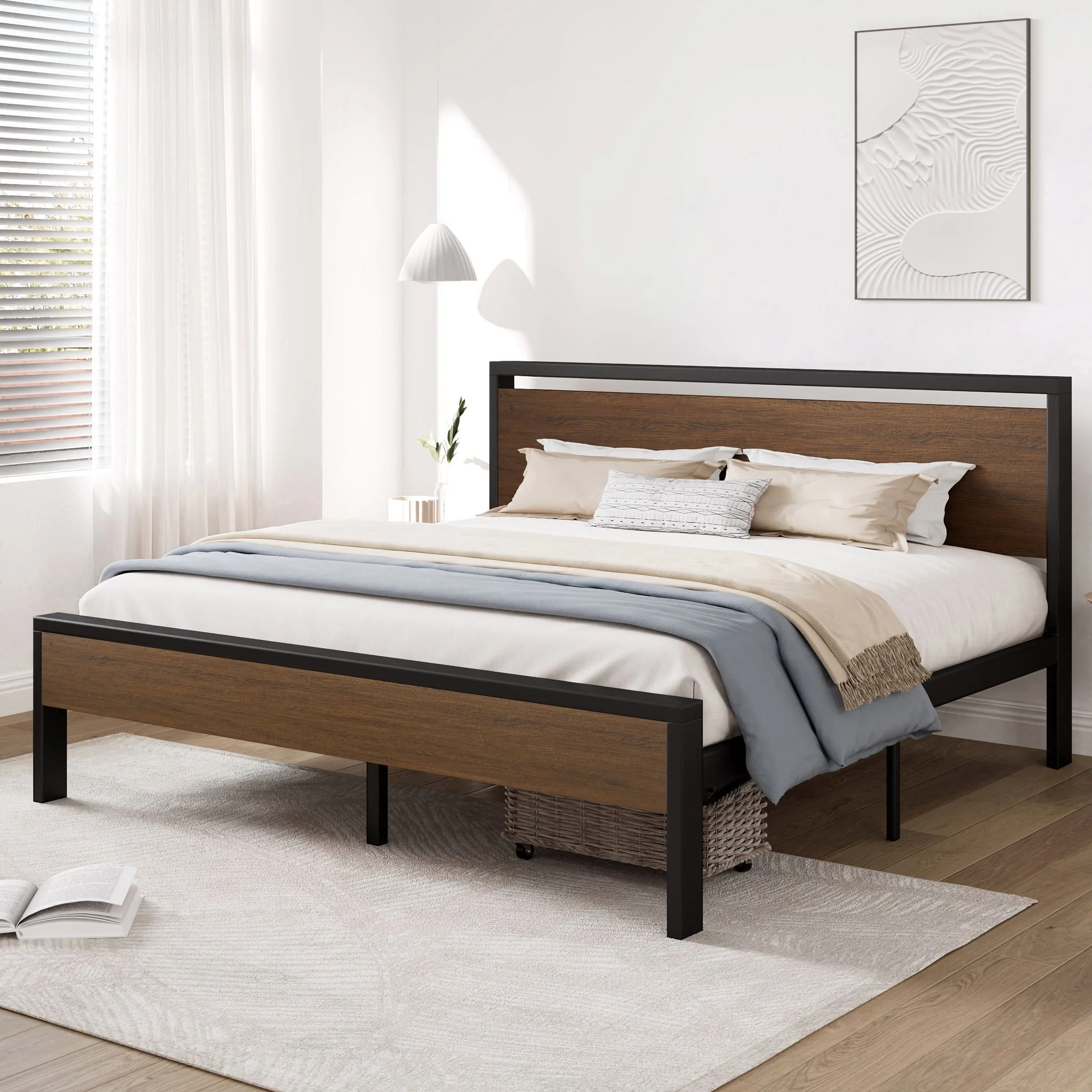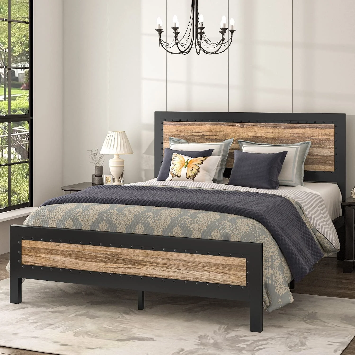 Allewie Brown Queen Size Metal Platform Bed Frame with Rivet Headboard and Black Frame, Industrial Wooden Headboard