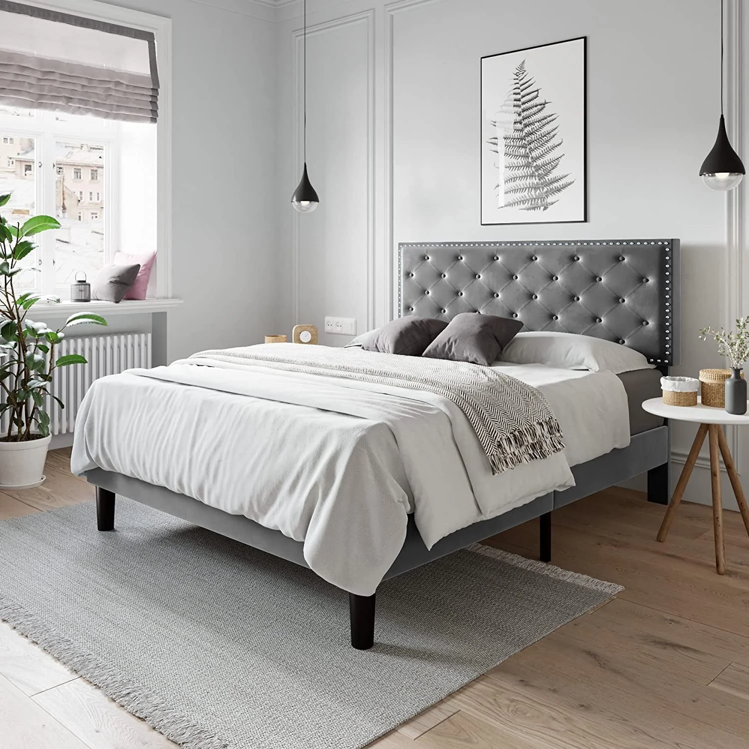 Allewie Queen Size Bed Frame, Velvet Upholstered Platform Bed with Adjustable Diamond Button Tufted & Nailhead Trim Headboard, Light Grey