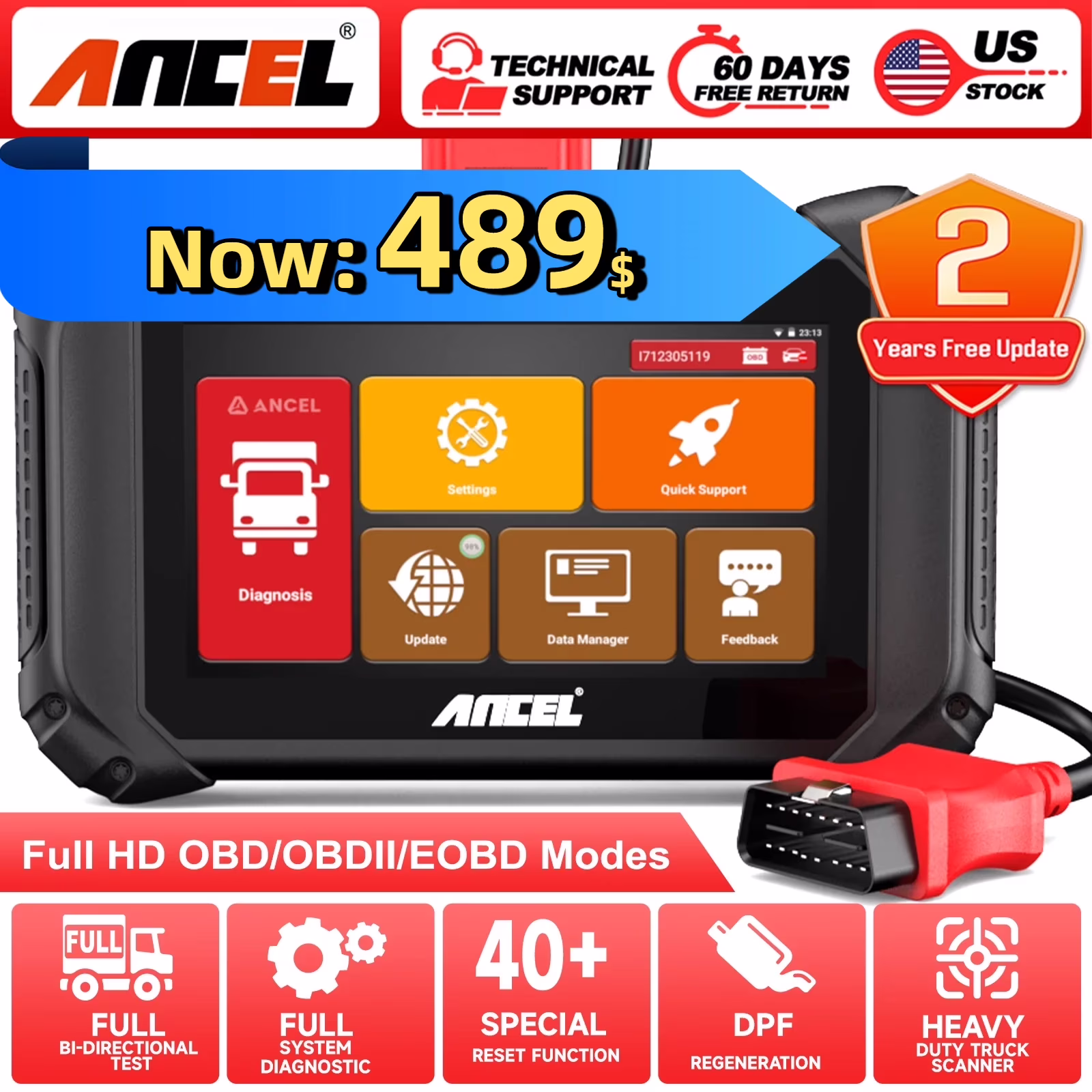 ANCEL V5 HD Heavy Duty Truck Scanner, Bidirectional Diesel Diagnostic Scan Tool, 40+ Resets Full System Car Diagnostic Tool ABS SRS DPF Regen for Truck & Commercial Vehicle