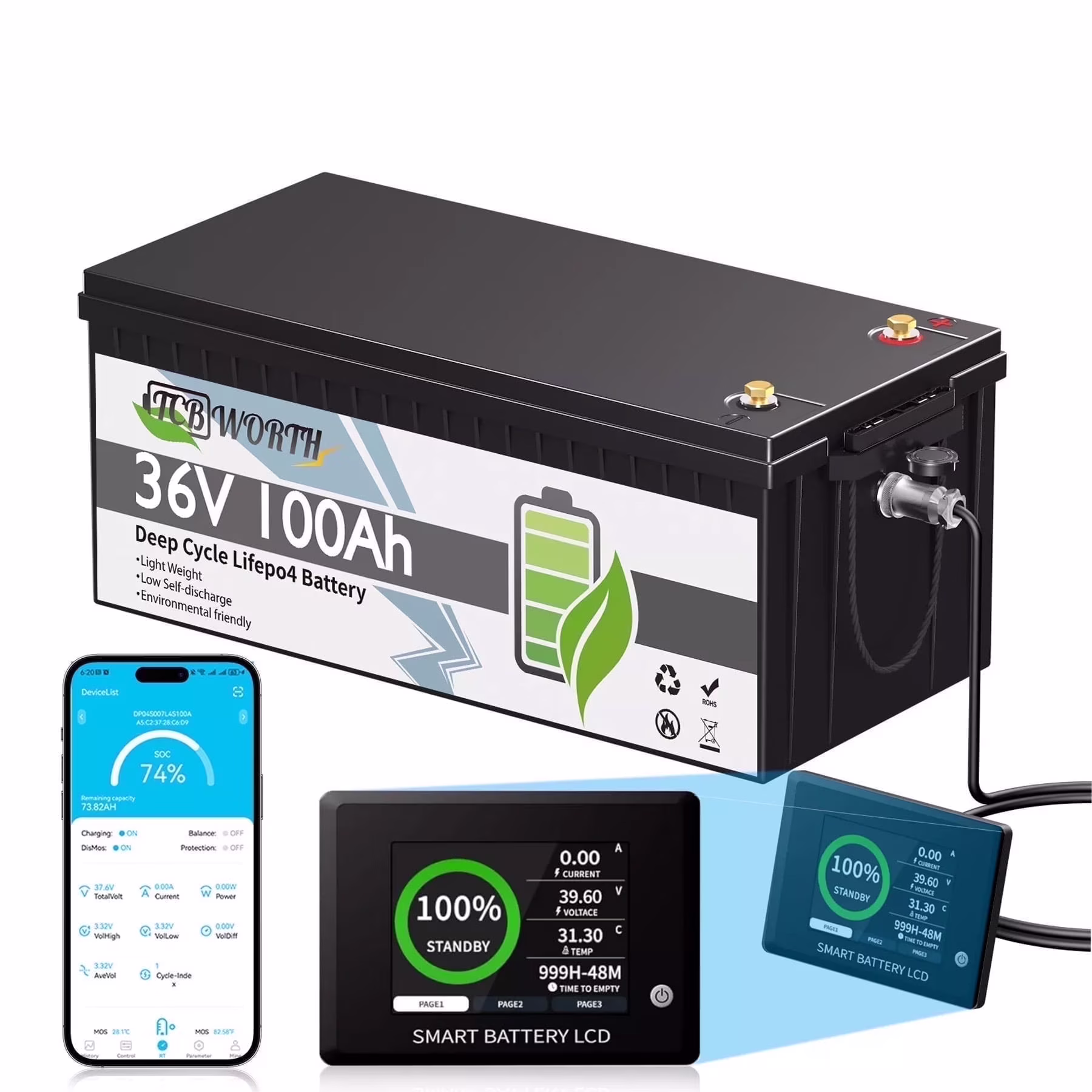 36V 100AH Golf Carts LiFePO4 Battery Bluetooth with Free APP Monitor,38.4V TCBWORTH for RV,Marine,Trolling Motor,Solar,Built in 200A BMS,7.68kW Output