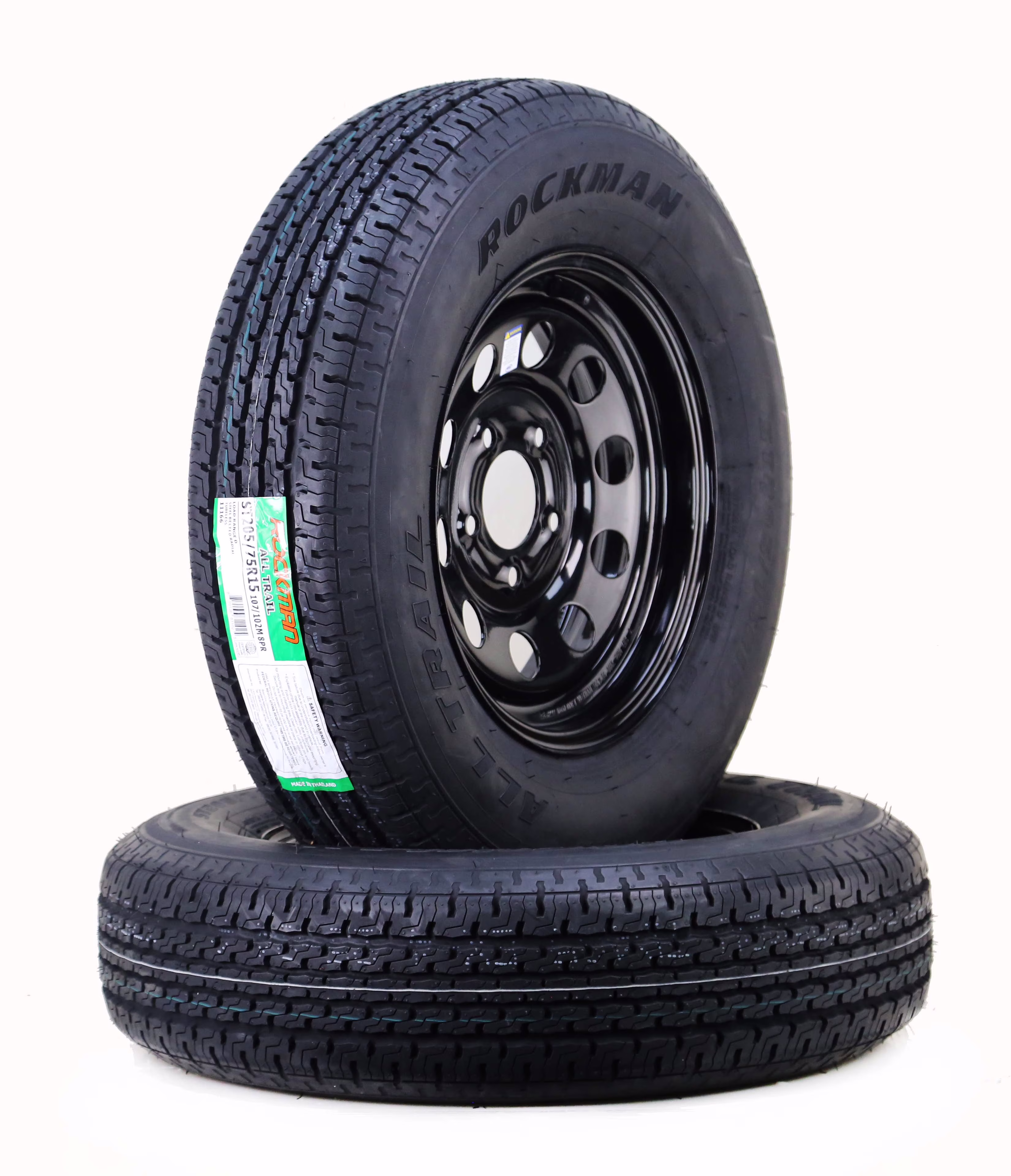 ROCKMAN Trailer Tire Wheel Assembly ST205/75R15 8-Ply D 107M 5 Lug on 4.5" PCD Black Mod Rim ,SET 2